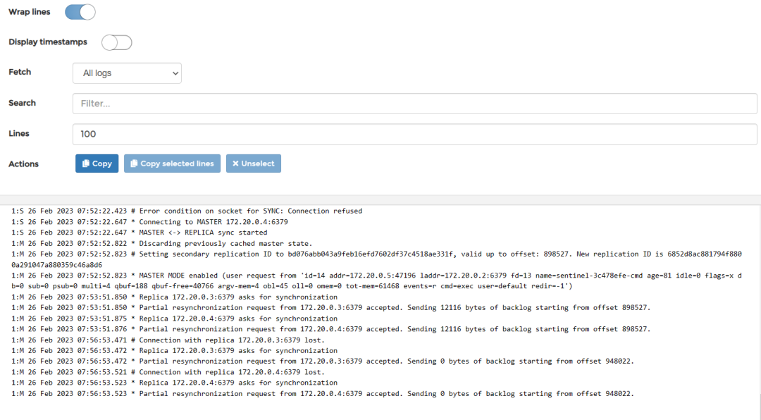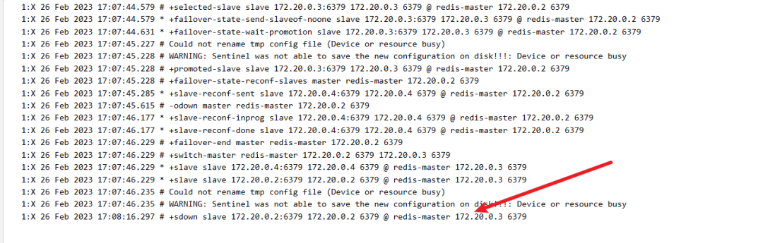 点入任意一个哨兵日志,可以看到它监控到主节点下线,并快速选举出一个新的节点作为master上线