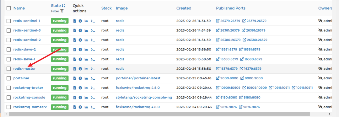 docker-compose -f redis-cluster.yml up启动完成后就可以在portainer中看到一主二从出现在containers列表中