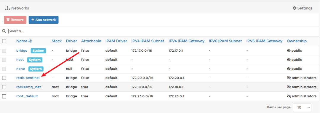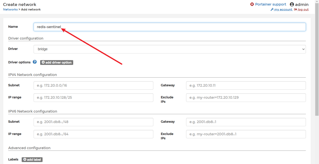 为了确保redis-sentinel可以统一管理且和其他容器隔离,我们在部署sentinel之前需要基于Portainer创建一个自定义的brige网络。