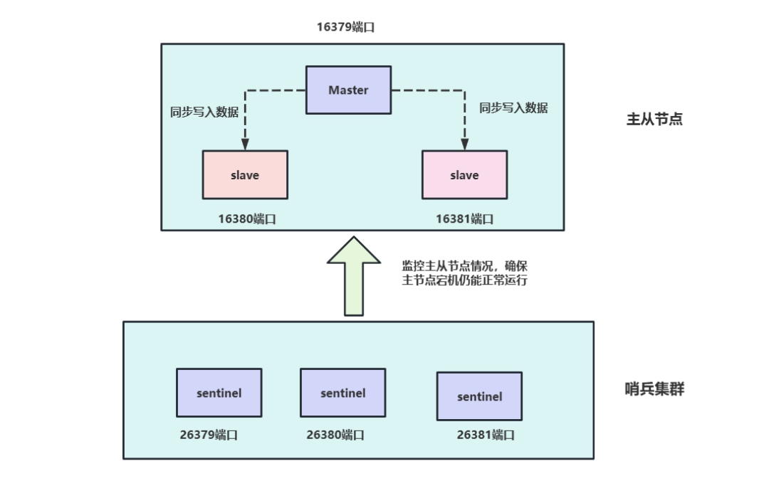 首先我们来介绍一下本次部署架构,我们会基于一台服务器完成一主二从+三个哨兵的部署架构,最终效果是: