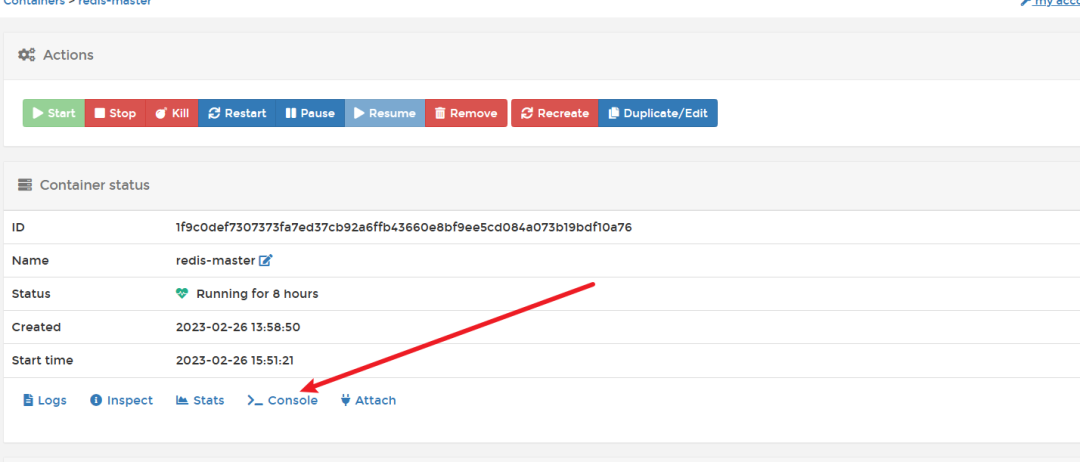 回到容器列表,点击redis-master进入容器管理界面