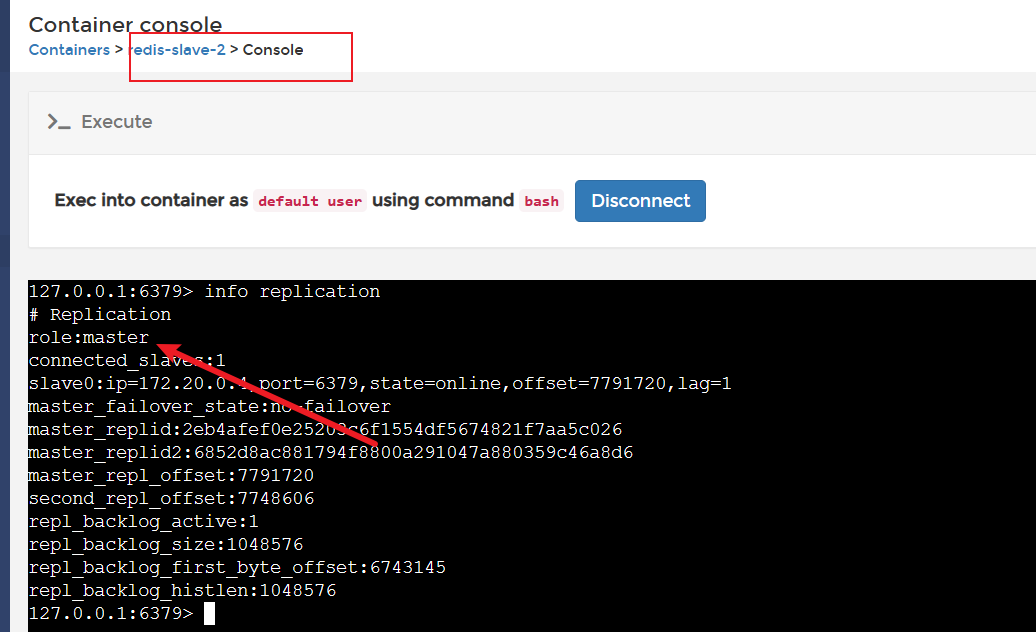 我们根据ip地址172.20.0.3定位到是slave2这个redis,我们进入容器查看其身份,确实变为master。
