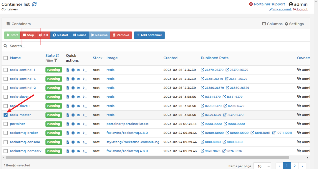 我们通过portainer图形界面将redis-master关闭。