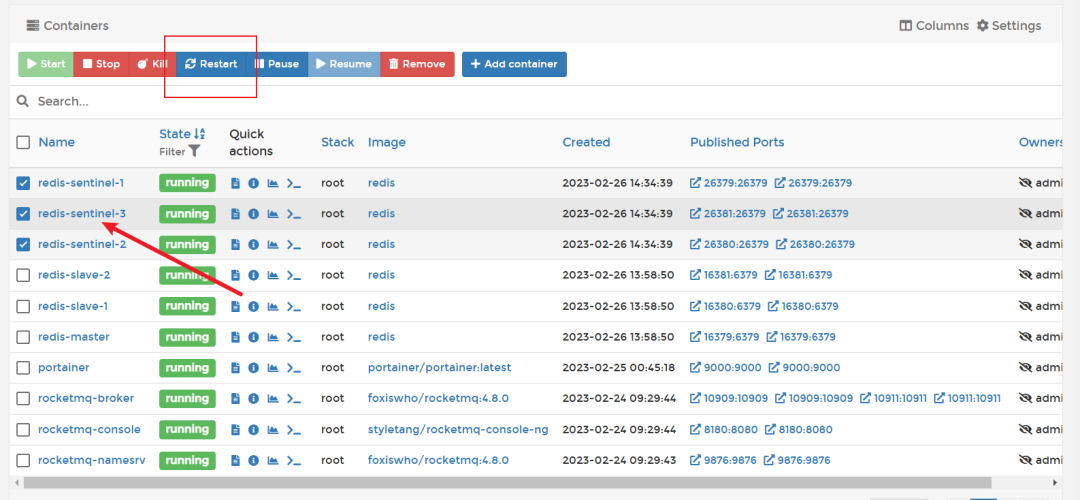 sentinel deny-scripts-reconfig yes完成后到portainer中重启哨兵