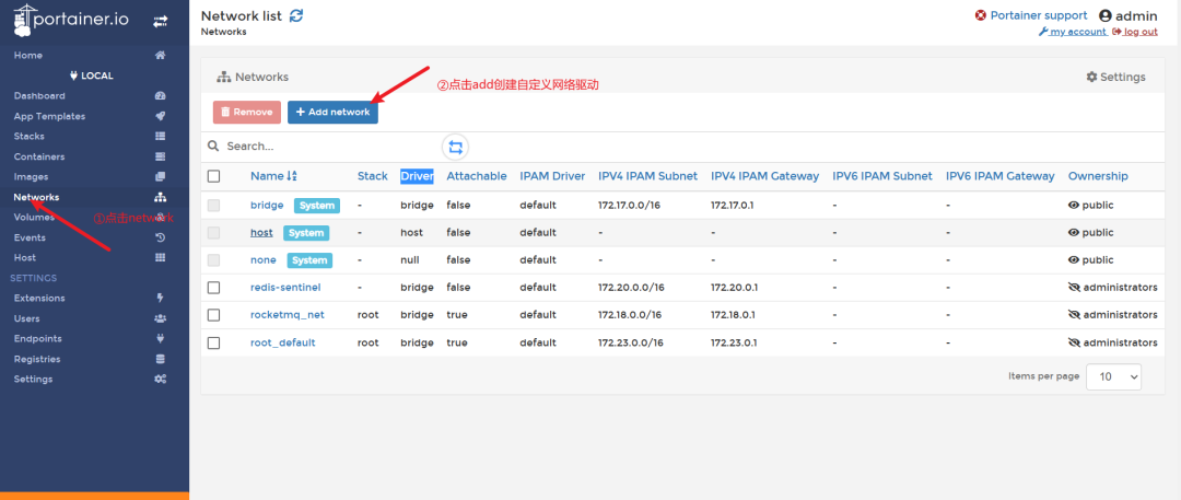 所以我们按照点击network,选择add network进行自定义网络创建