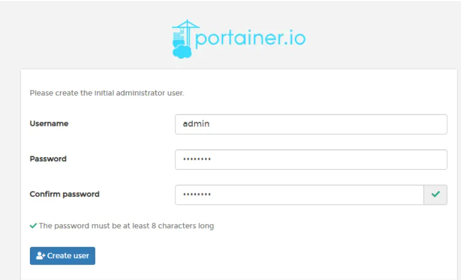 docker-compose -f portainer.yml up当控制台没有输出错误,并显示正常启动后,我们分开服务器的9000端口,浏览器输入服务器ip:9000,即可进入Portainer初始化界面,它会要求我们配置用户名密码: