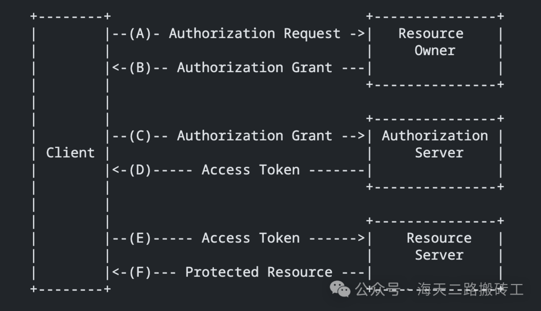 - (A)客户端(Client)向资源所有者(Resource Owner)请求资源授权。授权请求可以直接向资源所有者(Resource Owner)发起,不过最好是通过授权服务器(Authorization Server)间接发起。