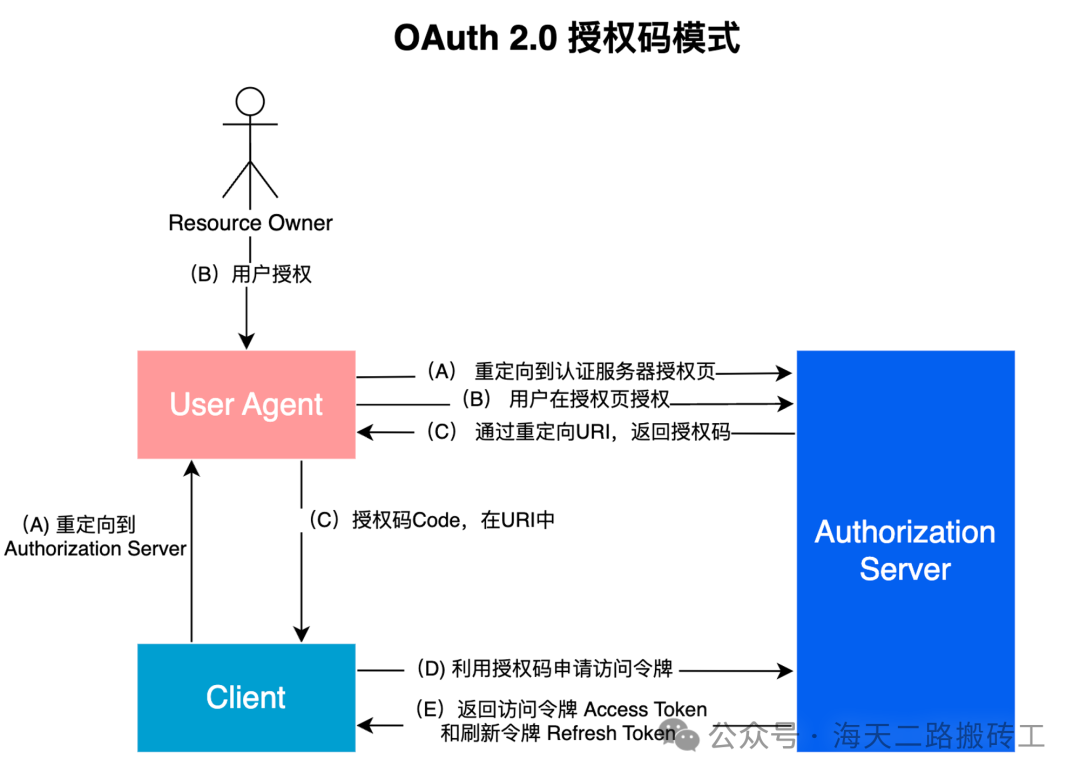 - (E)Authorization Server 校验授权码通过后,返回访问令牌Access Token和刷新令牌Refresh Token。