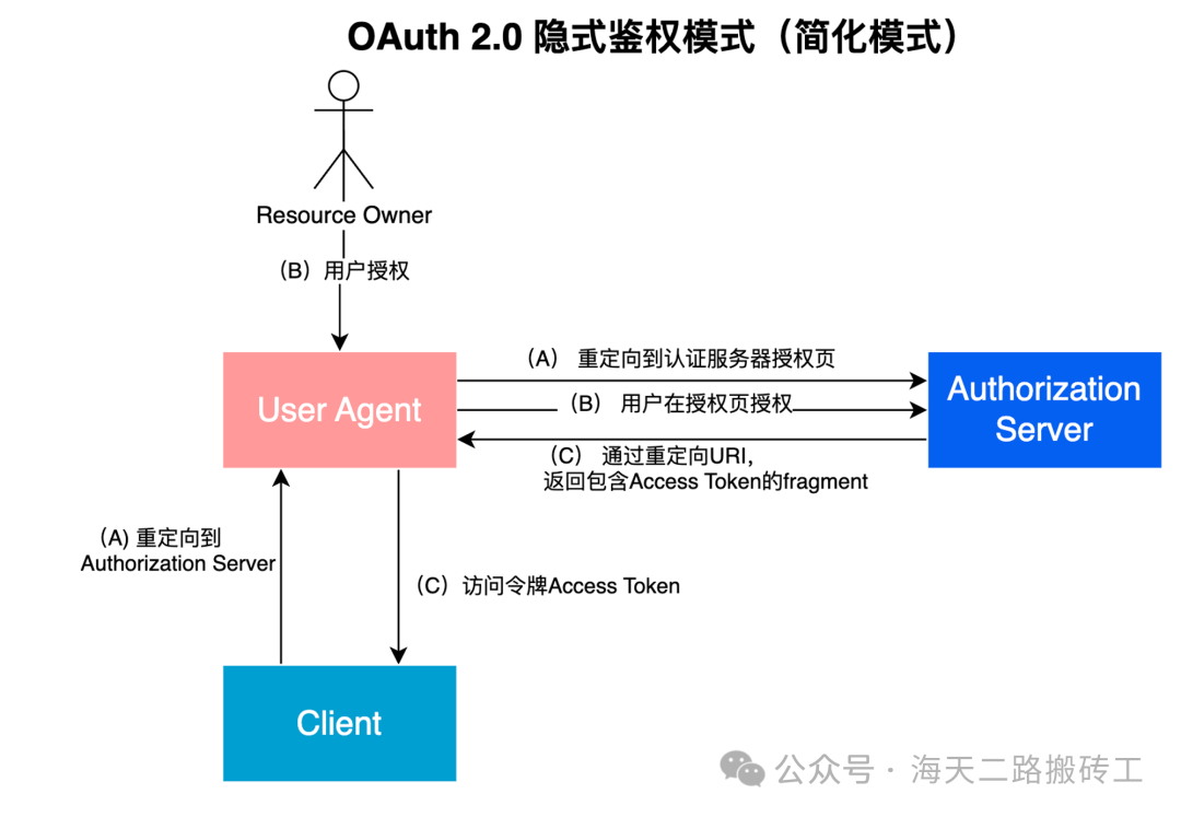 在隐式授权模式中,不是向客户端颁发授权码,而是直接向客户端颁发访问令牌(作为资源所有者授权的结果)。省去了颁发中间凭据(例如授权代码)的过程。