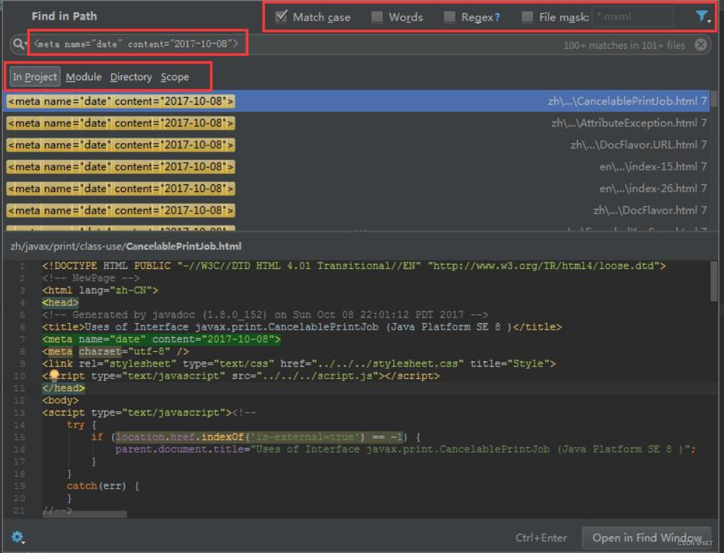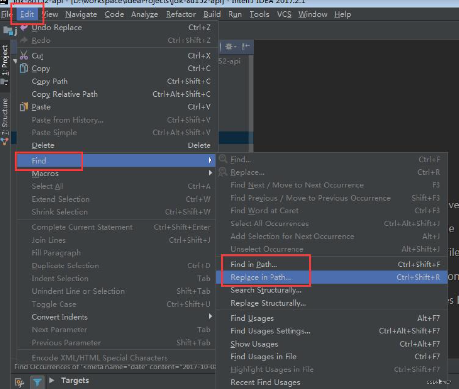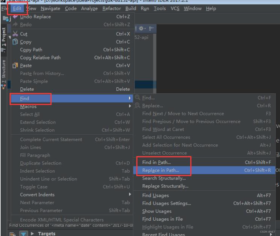 1、使用快捷键Ctrl+Shift+F打开搜索窗口,或者通过点击Edit–>Find–>Find in path打开搜索窗口,如下图: