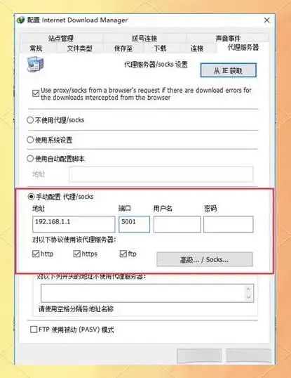 输入自己的代理服务器的IP地址、端口号,以及服务器的用户名和密码。在服务器协议方面,建议勾选http、https和ftp协议。完成以上信息的填写后,点击“确定”以保存设置。