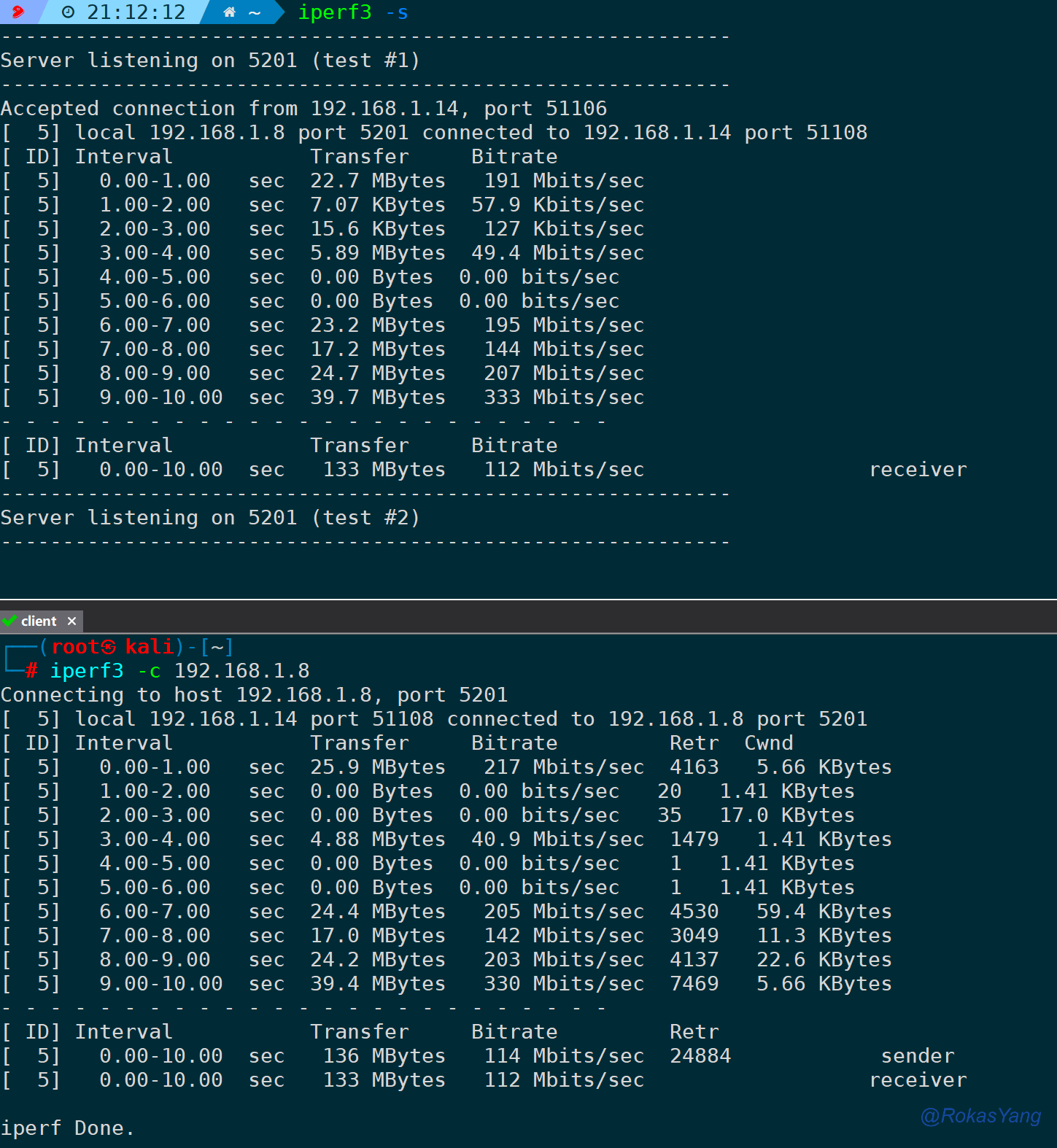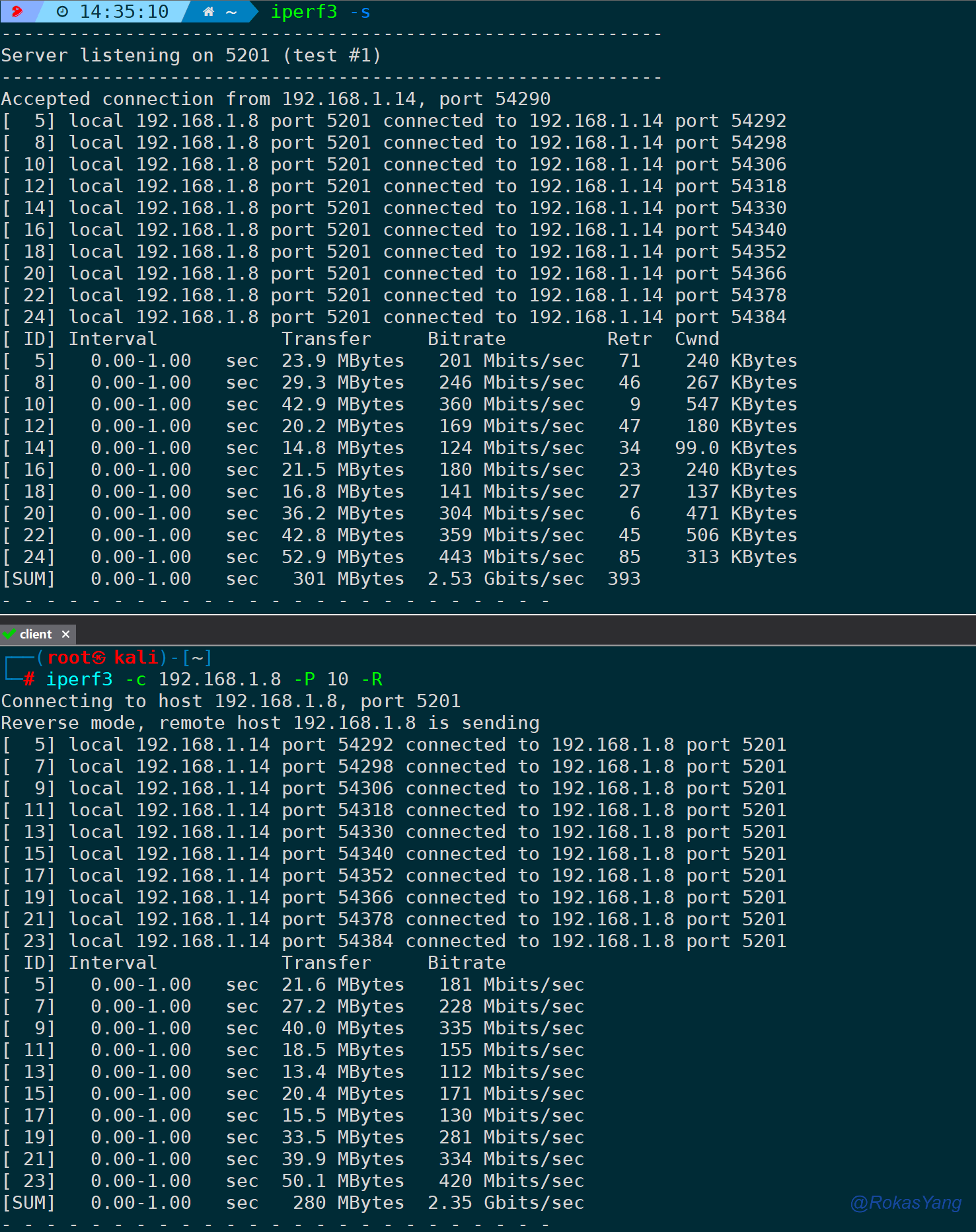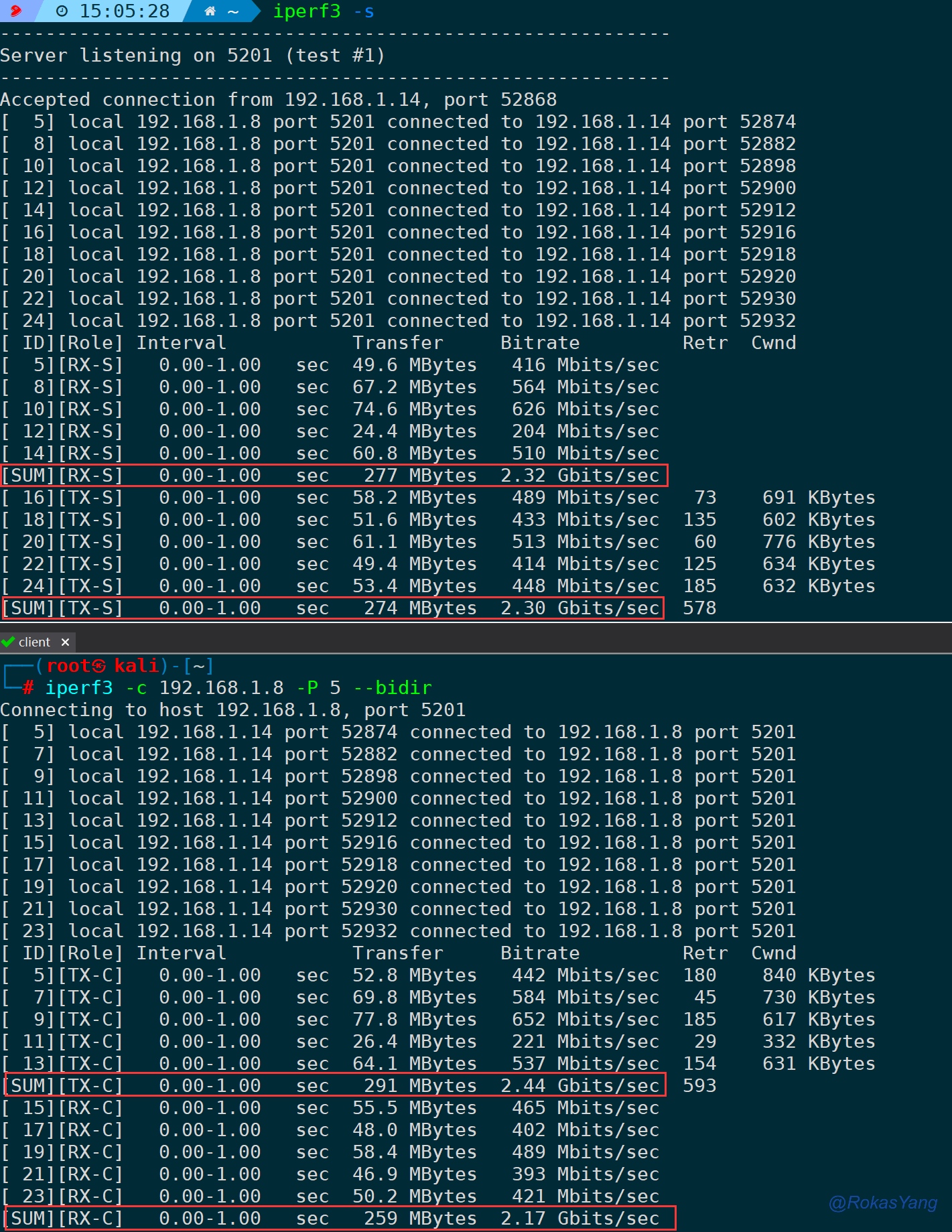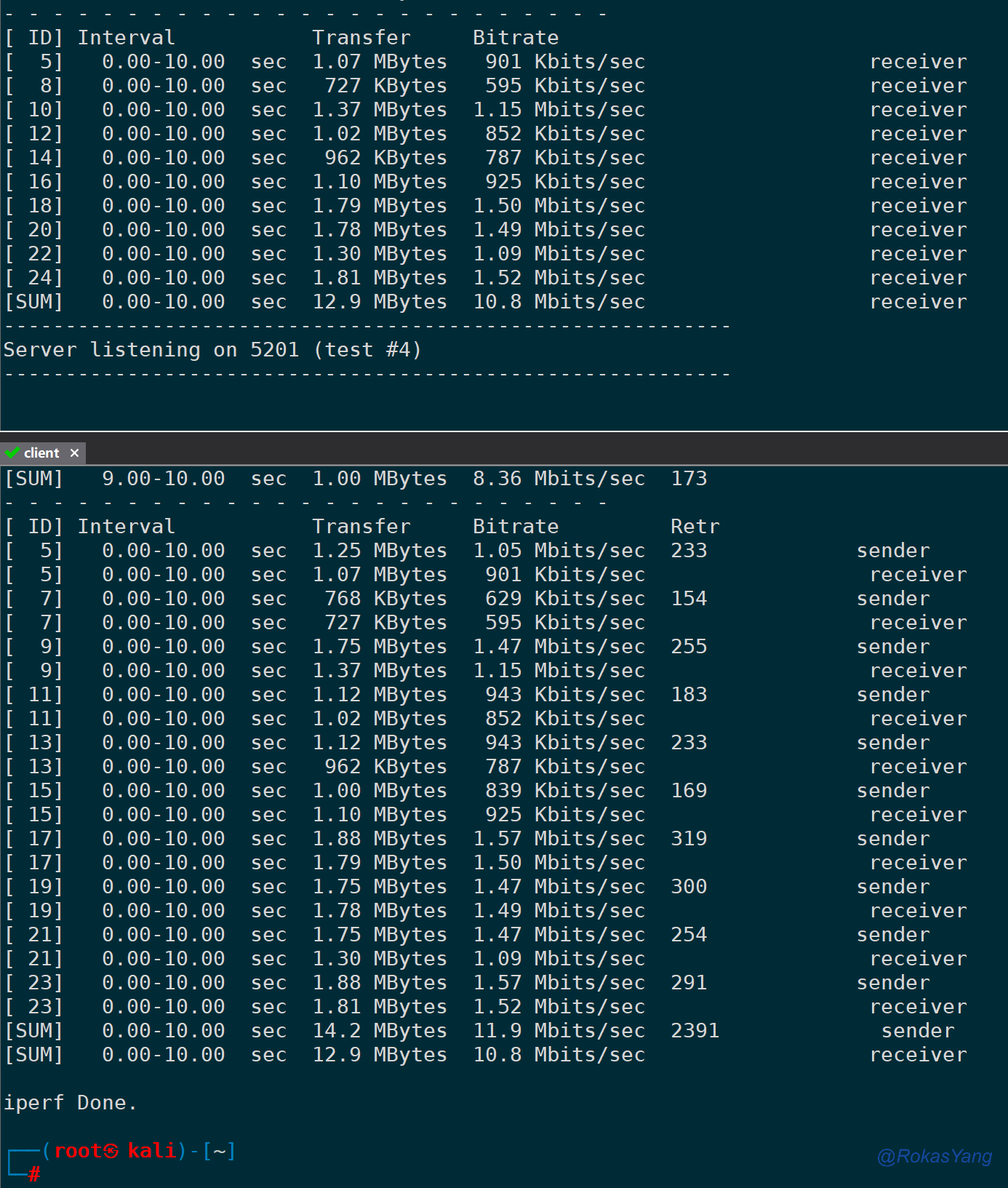 再仔细观察可以发现,虽然两个方向都进行压测,但无一例外都是客户端主动去连接服务端,即使指定的是5个线程,此时双向压测,iperf3则开了10个线程,其中5个连接正向传输,另外5个连接反向传输: