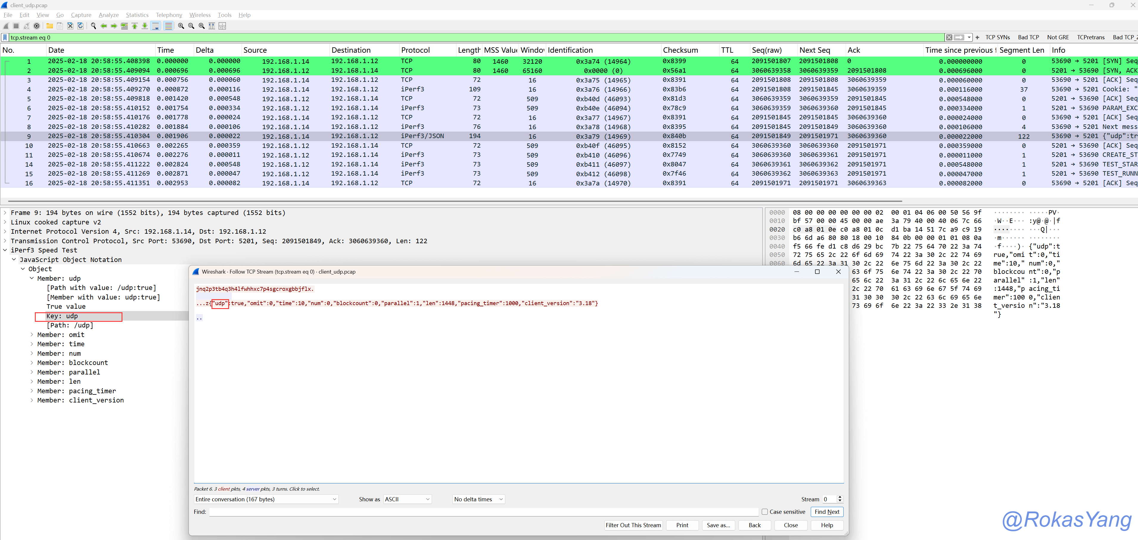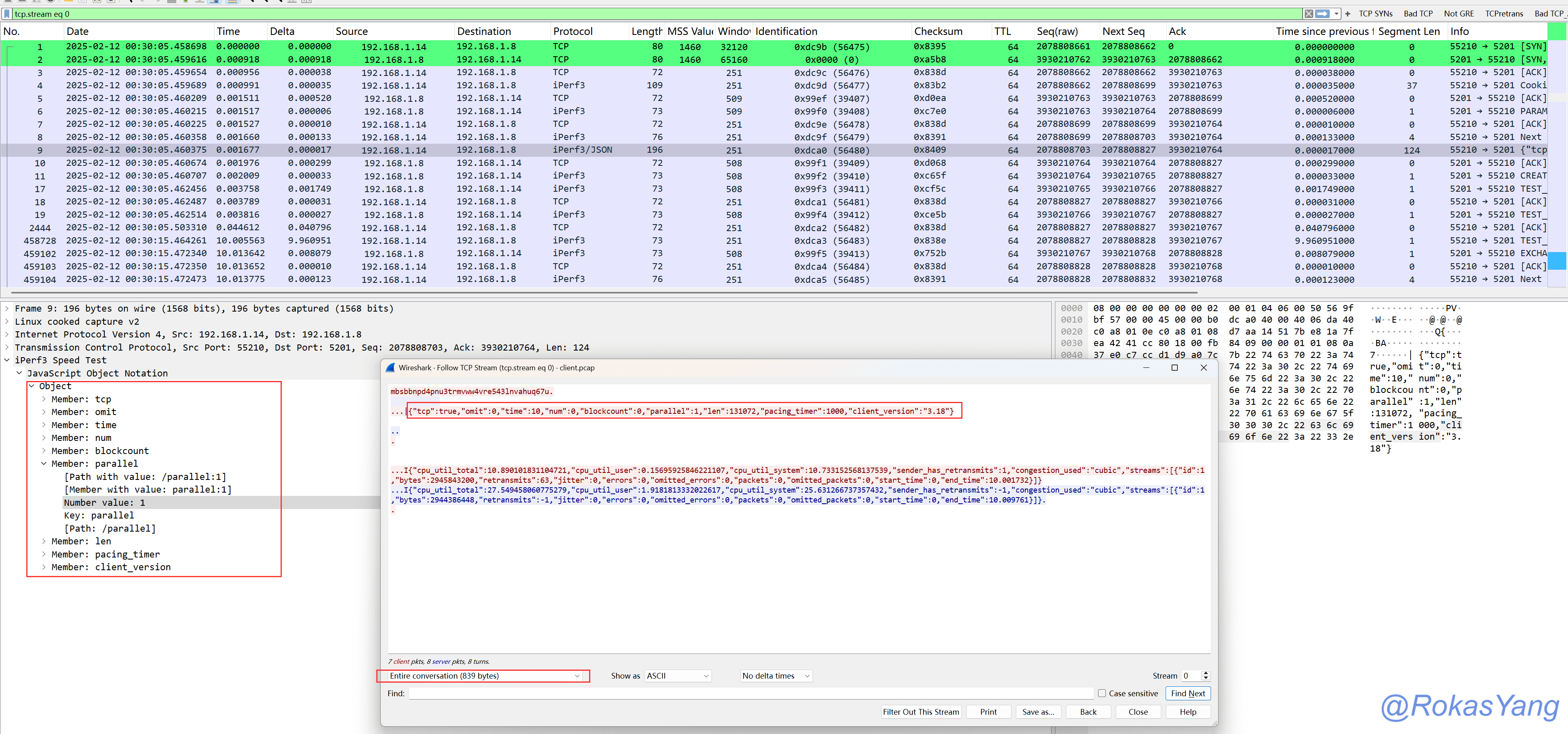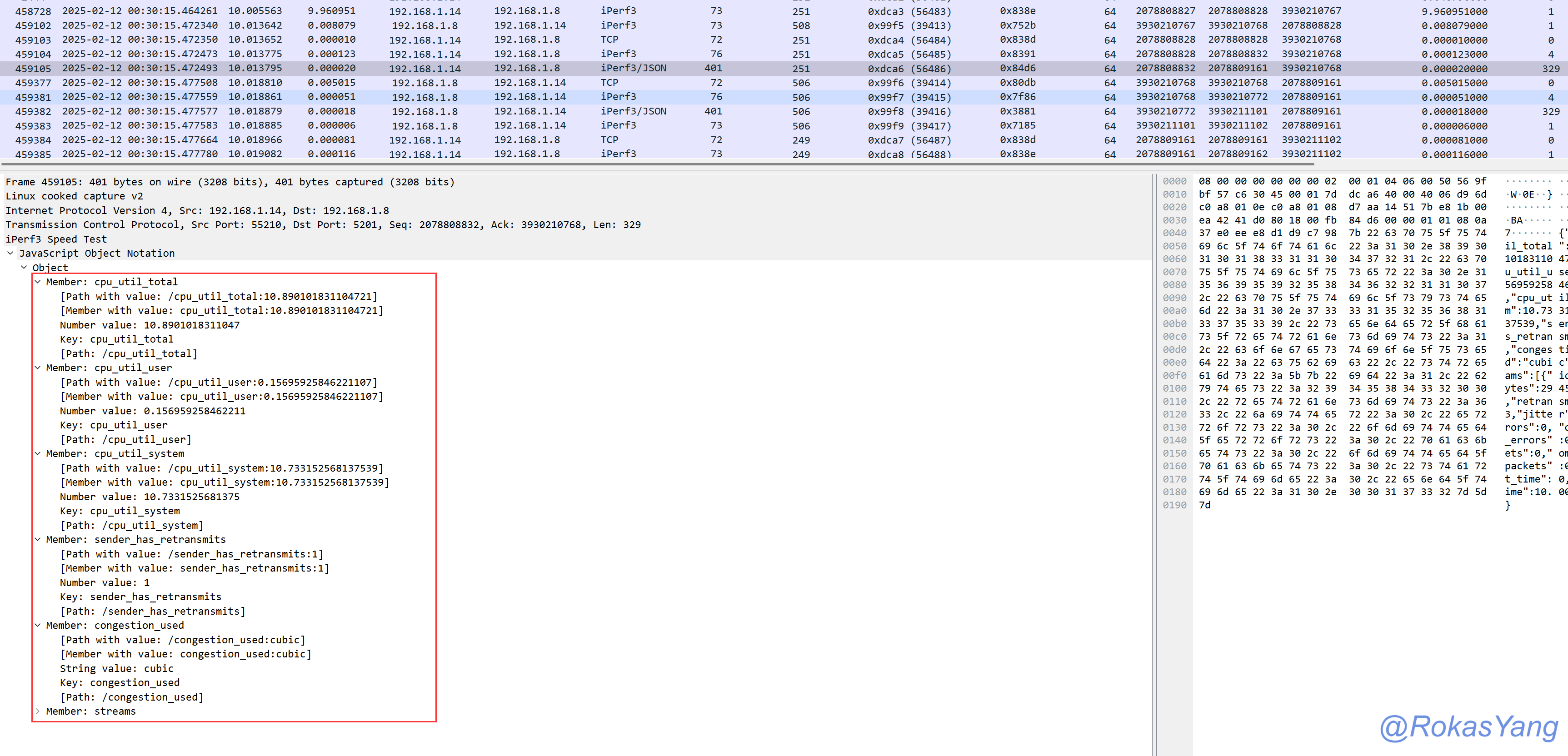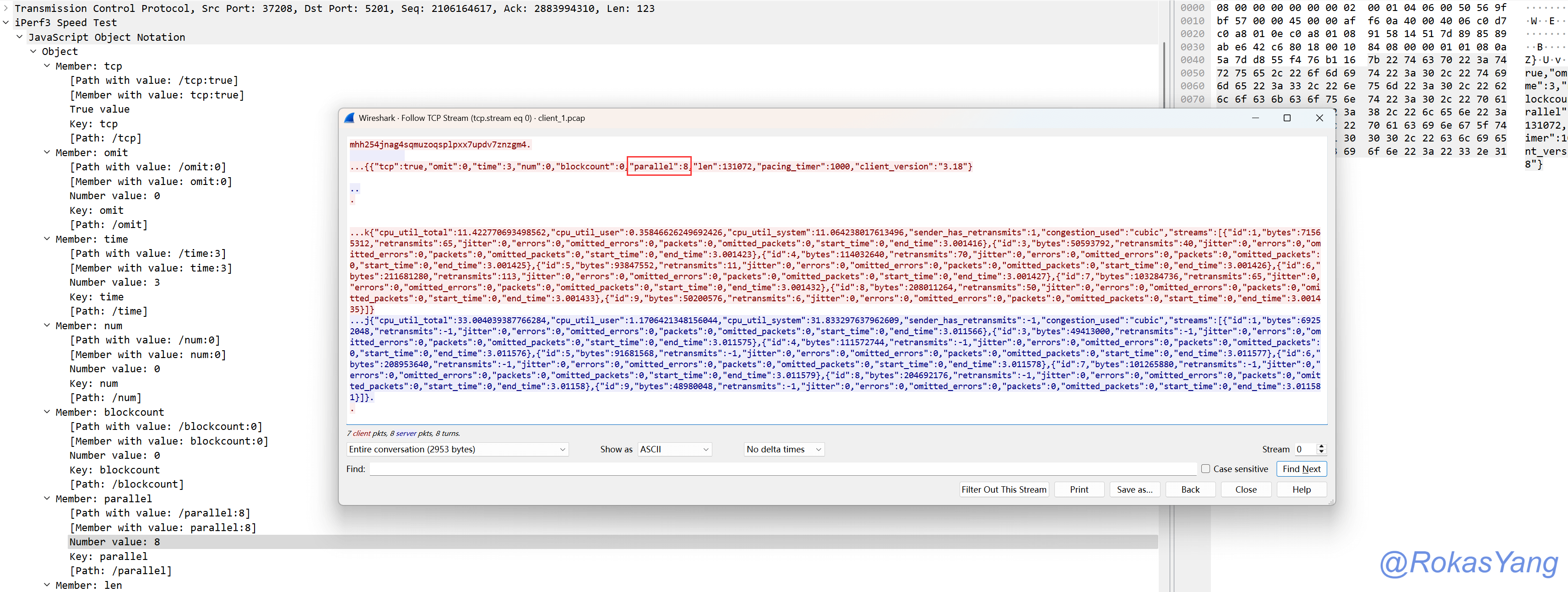通过抓包可以看到,iperf3发起了两个TCP连接,第一个TCP连接主要通过json格式传输一些参数控制,因为在正式传输压测数据前,客户端与服务器通要过此连接交换测试配置信息(如测试时长、数据包大小、并行流数量等):