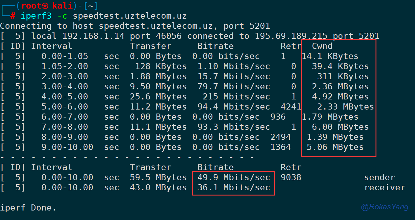 Cwnd拥塞窗口起不来,影响最终的吞吐量测试,Retr字段可以看到重传数量比较多。