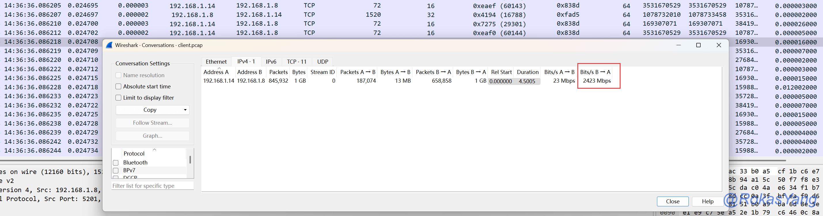 Wireshark的会话页面可以看到,A到B和B到A基本都被打满了:
