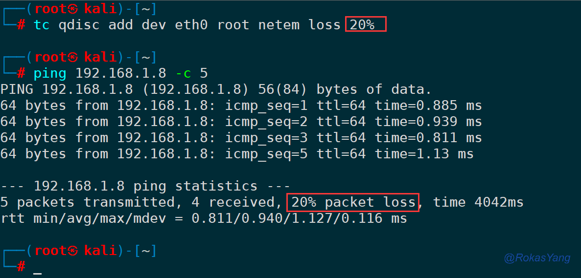 sudo tc qdisc add dev eth0 root netem loss 20% # eth0 替换为你的网卡名