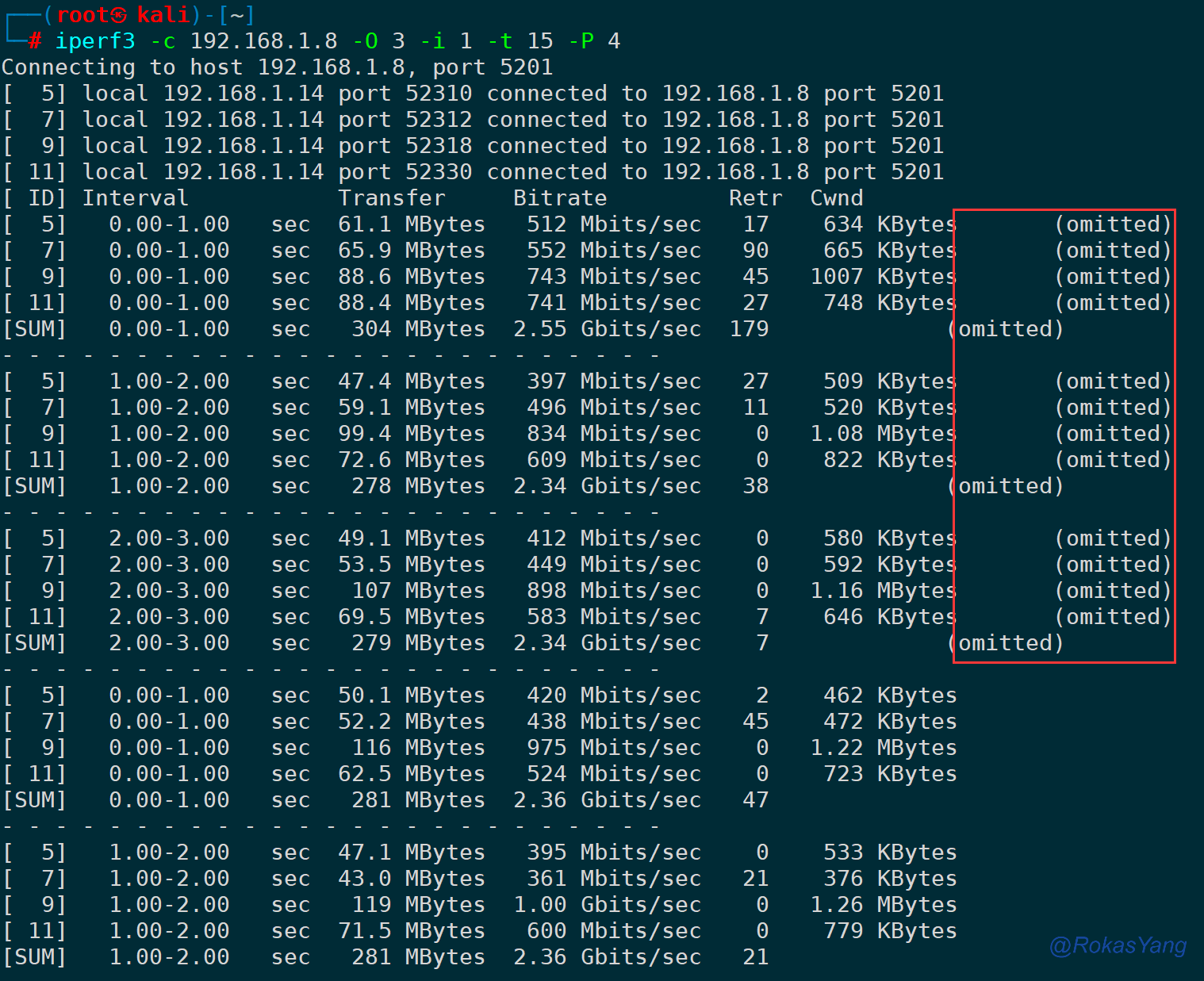 iperf3 -c <server_ip> -P 10 -t 60启动10个并行线程,跳过前2秒的TCP慢启动阶段,每秒输出一次状态: