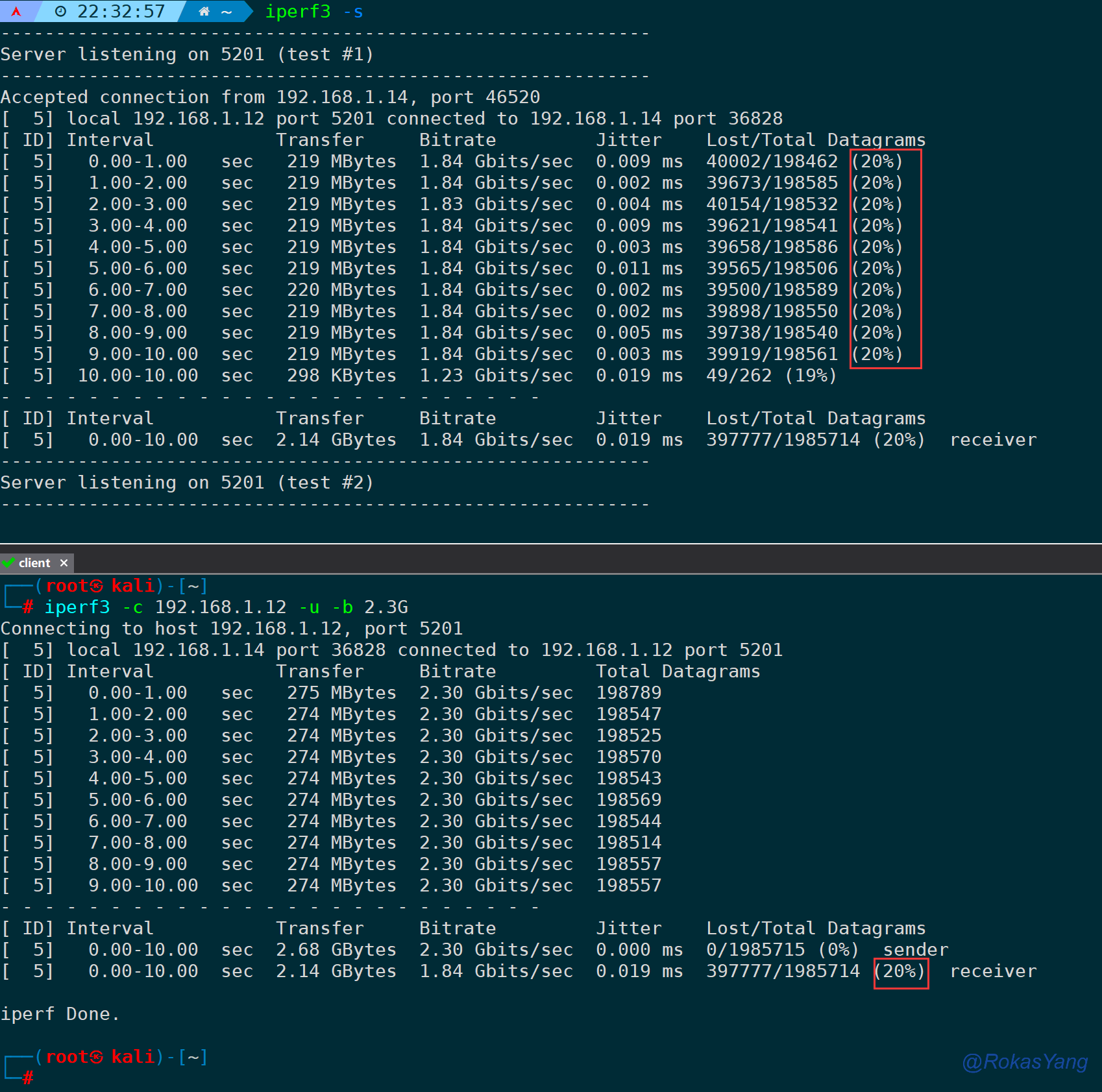 A压测B,对于客户端A来说,压测的是出带宽,即使丢包率20%也不影响出带宽压测,因为UDP是无状态的,没有拥塞控制算法,不关心发出去没发出去,因此依然可以压测出2.3G带宽,对于服务端B来说,客户端A发给它的压测数据丢了20%,因此入口只能收到80%的包:2.3G * 0.8 = 1.84Gbps,和上图吻合。
