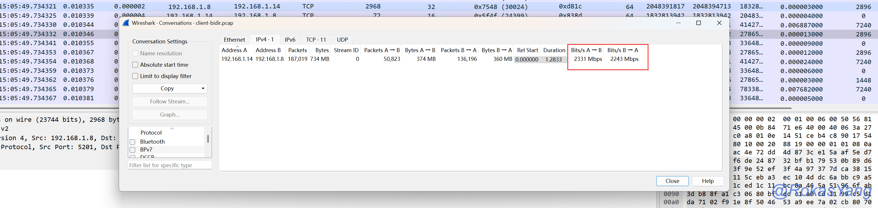 到第二个TCP连接才开始传输压测数据,可以看到TCP会话界面,第一个TCP会话是一些元数据的交换因此没什么太多数据需要传输,第二个TCP会话传输了3GB数据,客户端(A)往服务端(B)压测的带宽速率为2332Mbps,这个方向对于客户端A来说,主要占用的是出带宽,对于服务端B来说,主要占用的是入带宽: