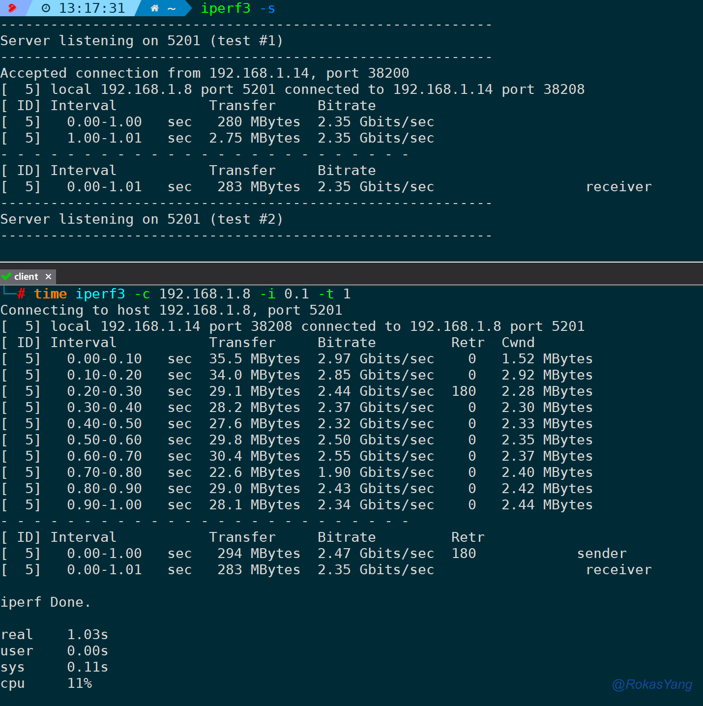 方便直观展示输出这里只用了5个线程压测,根据业务情况按需选择。可以看到客户端和服务端都有两个方向的带宽速率统计:TX-C即从客户端发送出去的带宽(Transmit-Client),RX-C从客户端接收到的带宽(Receive-Client),RX-S 服务端接收带宽(Receive-Server),TX-S服务端发送出去的带宽(Transmit-Server)。