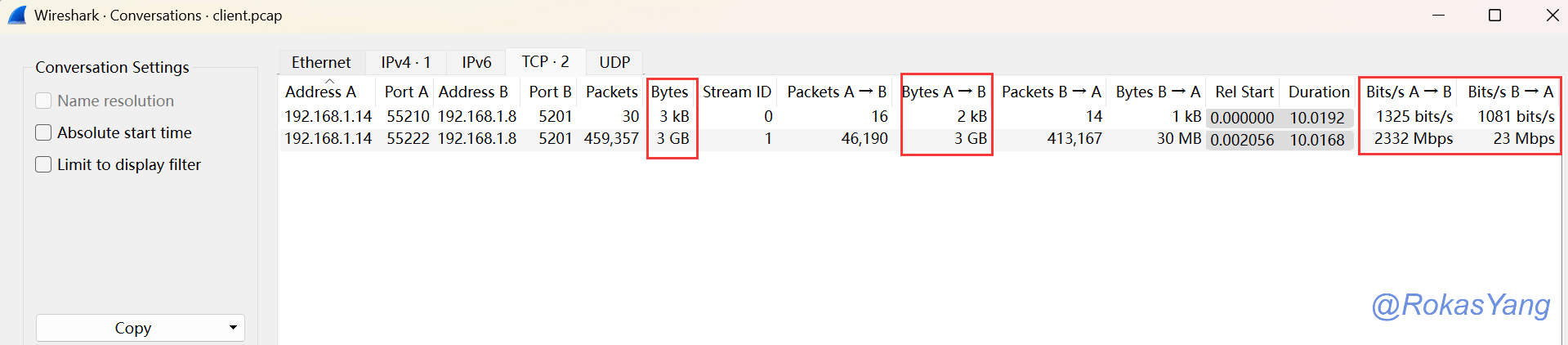 因为第一个TCP连接是iperf3客户端和服务端交互的一些元数据,还没真正开始压测数据,这一步为压测做准备,可以参考上面的 3.1.2 章节。