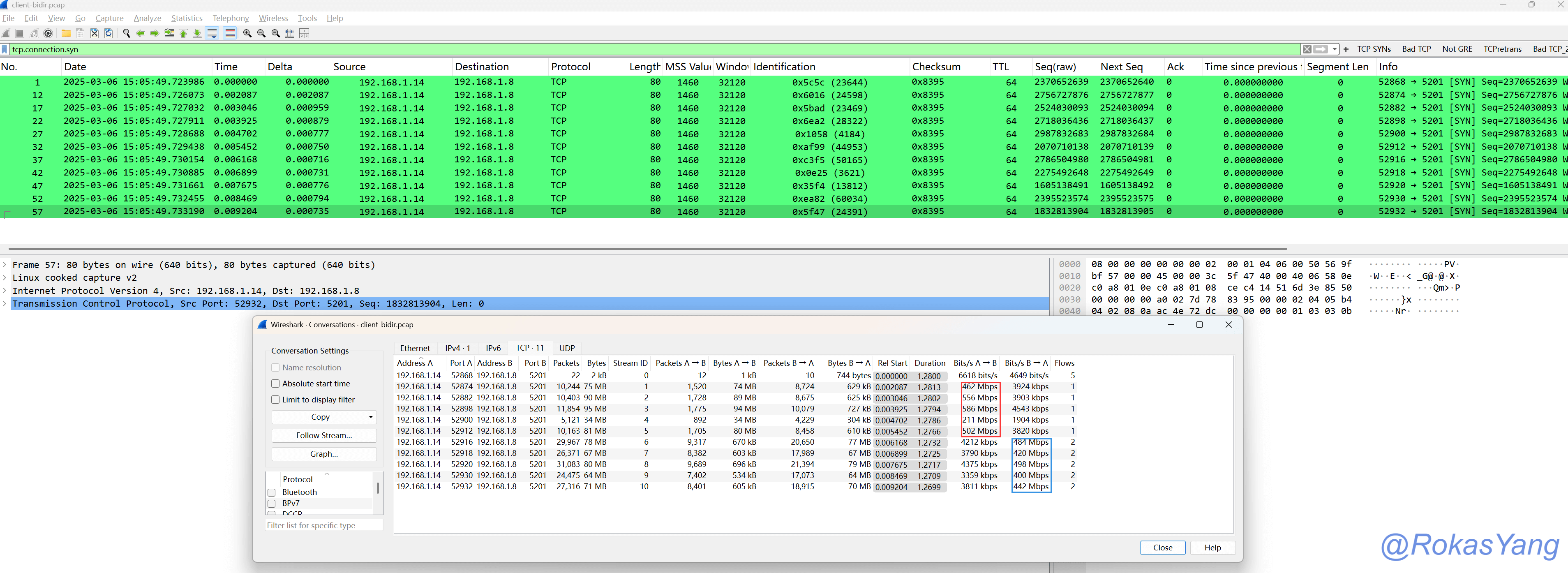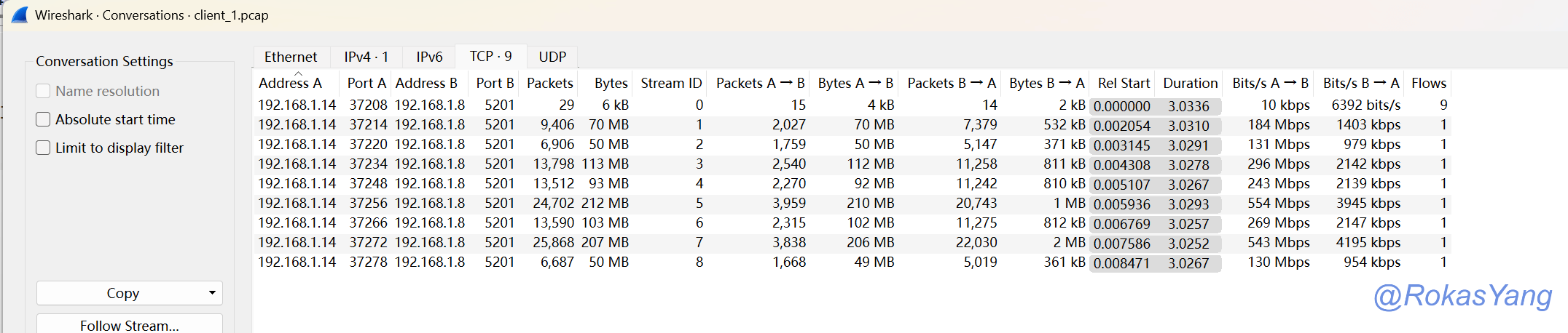 一共包含9个TCP会话,其中第一个会话是前面讲过的iperf3进行的元数据交换阶段,不纳入8个线程当中: