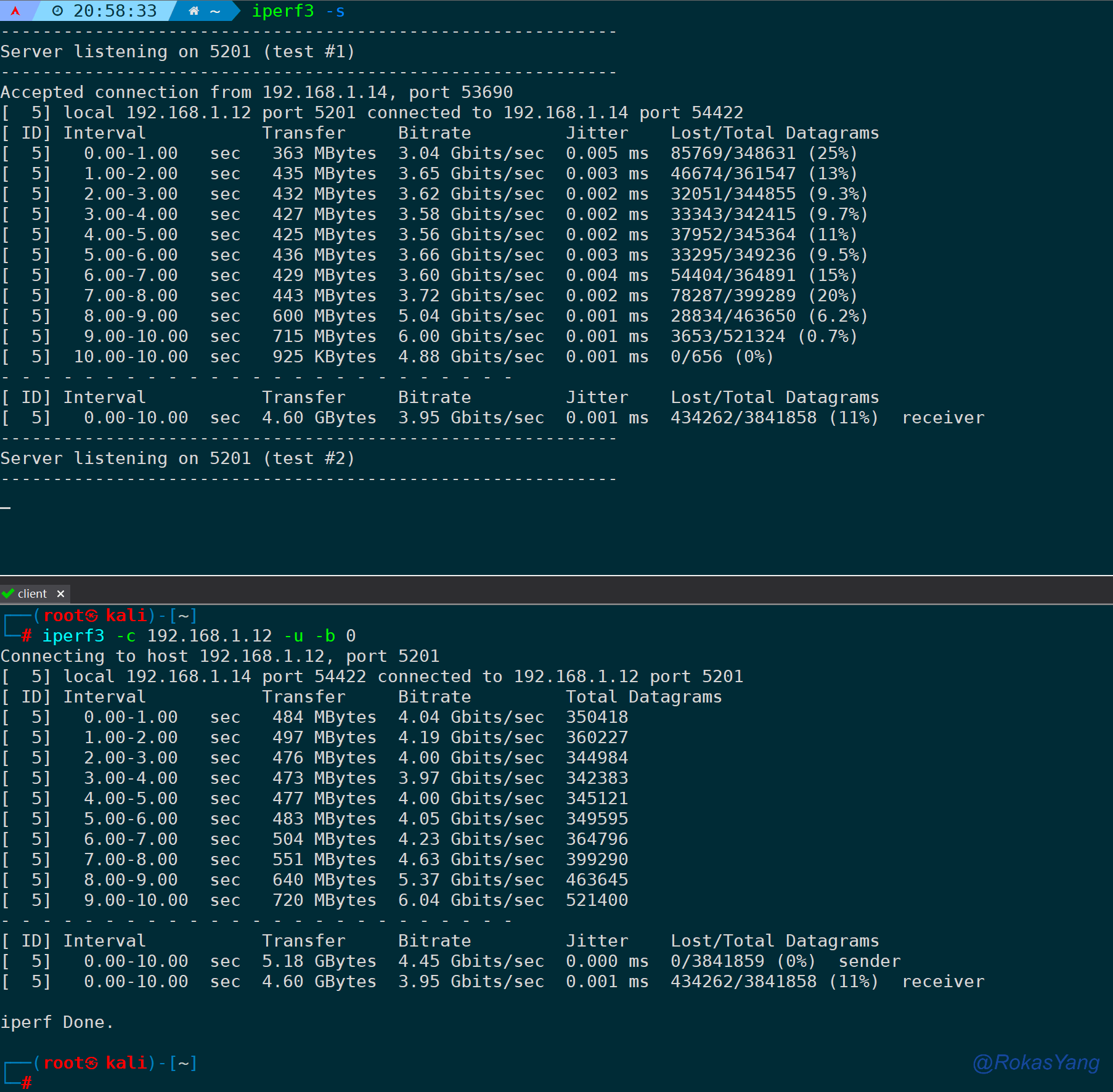 客户端 A | 192.168.1.14 | Kali Linux | 2.5Gbps | 100ms左右 | UDP |