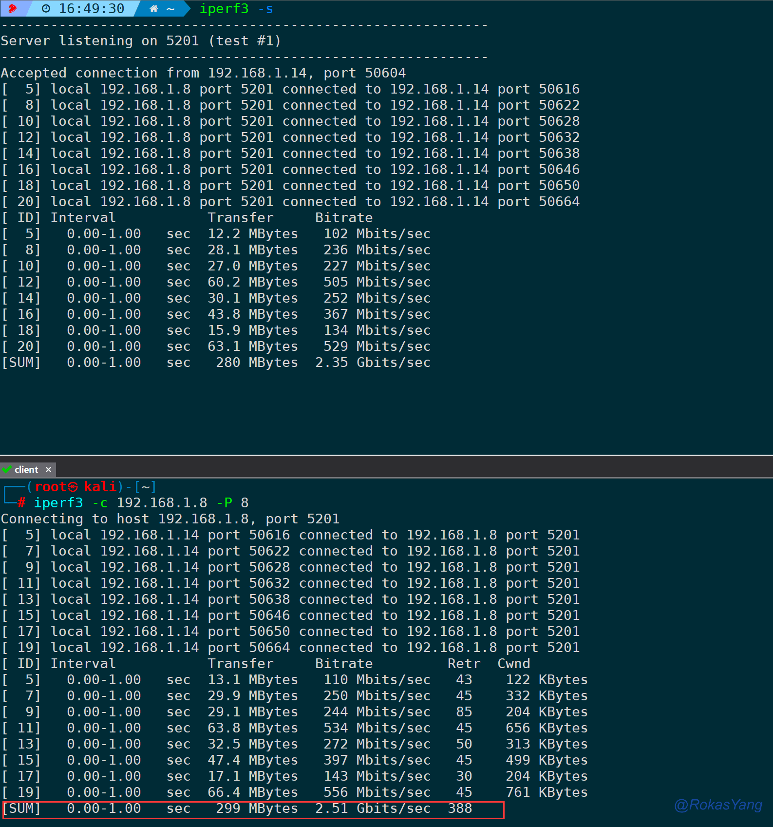 iperf3 -c <server_ip> -P 8-P 8 指定8个线程