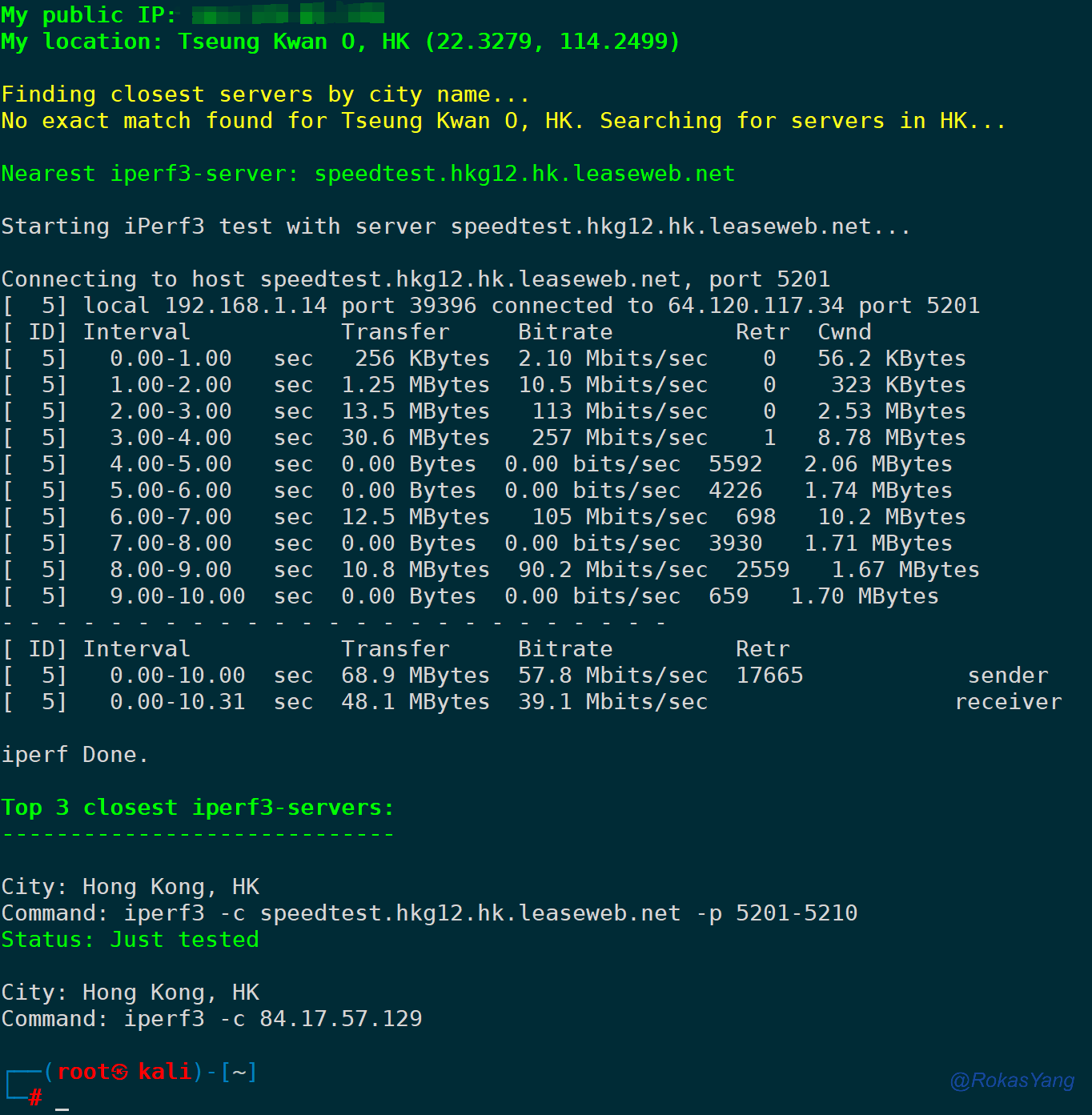 选出最近节点后,可以自定义iperf3命令去压测目标节点。比如上述截图中脚本已经帮你选好了节点,可以进行反向多线程压测:
