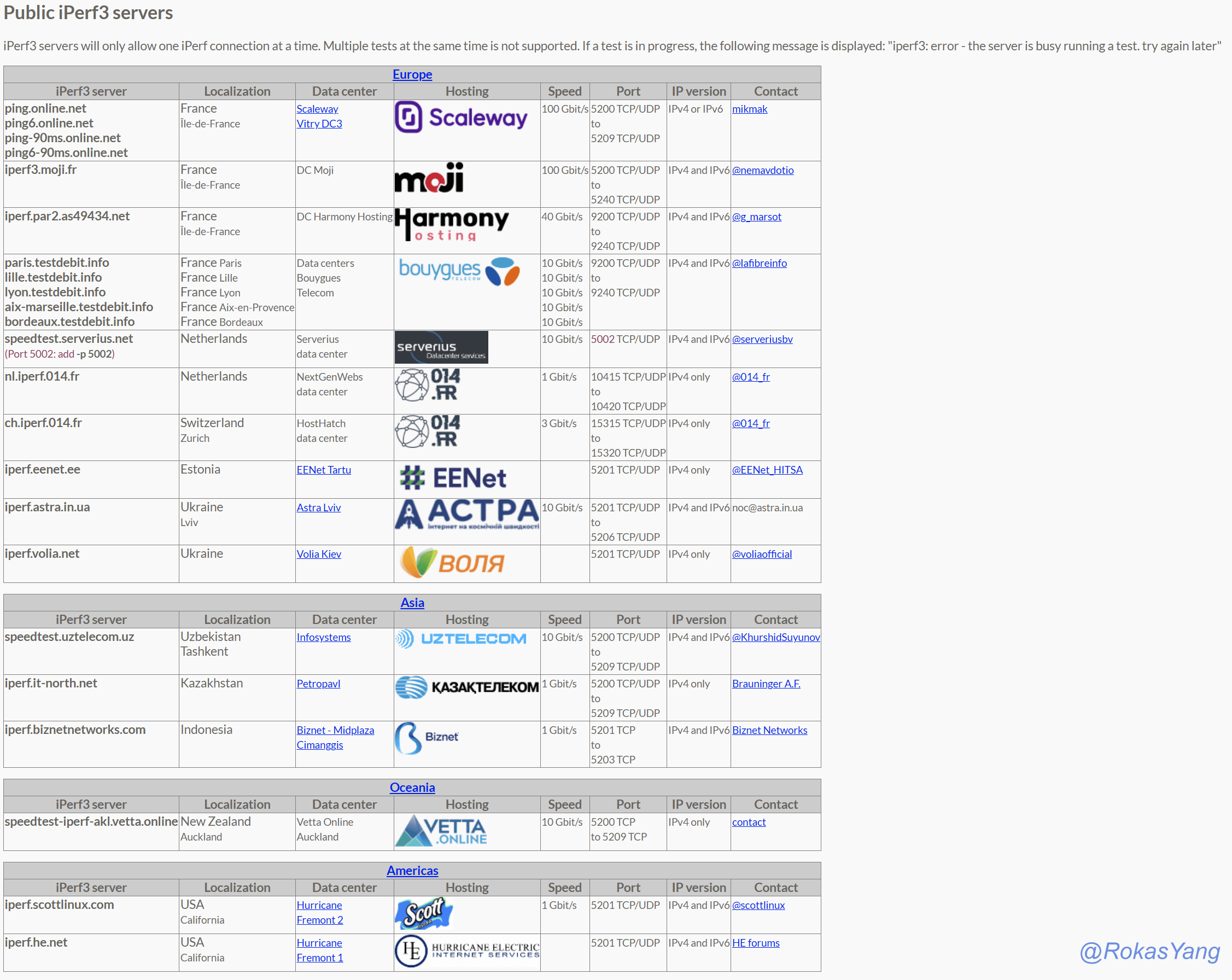 iperf3官方推荐的公共测试服务器,可以参考此列表,截至目前,节点主要分布在欧洲、亚洲、大洋洲、美洲。