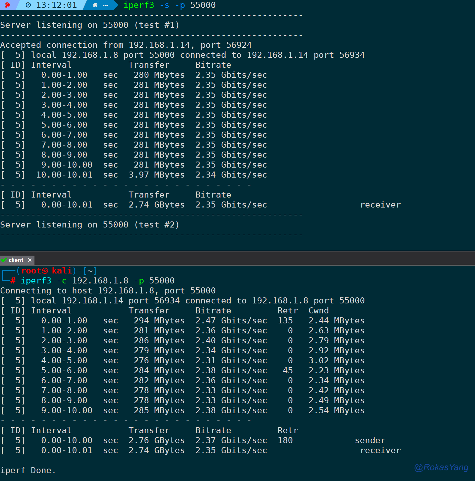 iperf3 -s -p 55000 # 指定端口为55000当服务端通过指定自定义端口后,客户端也需通过-p指定对端端口: