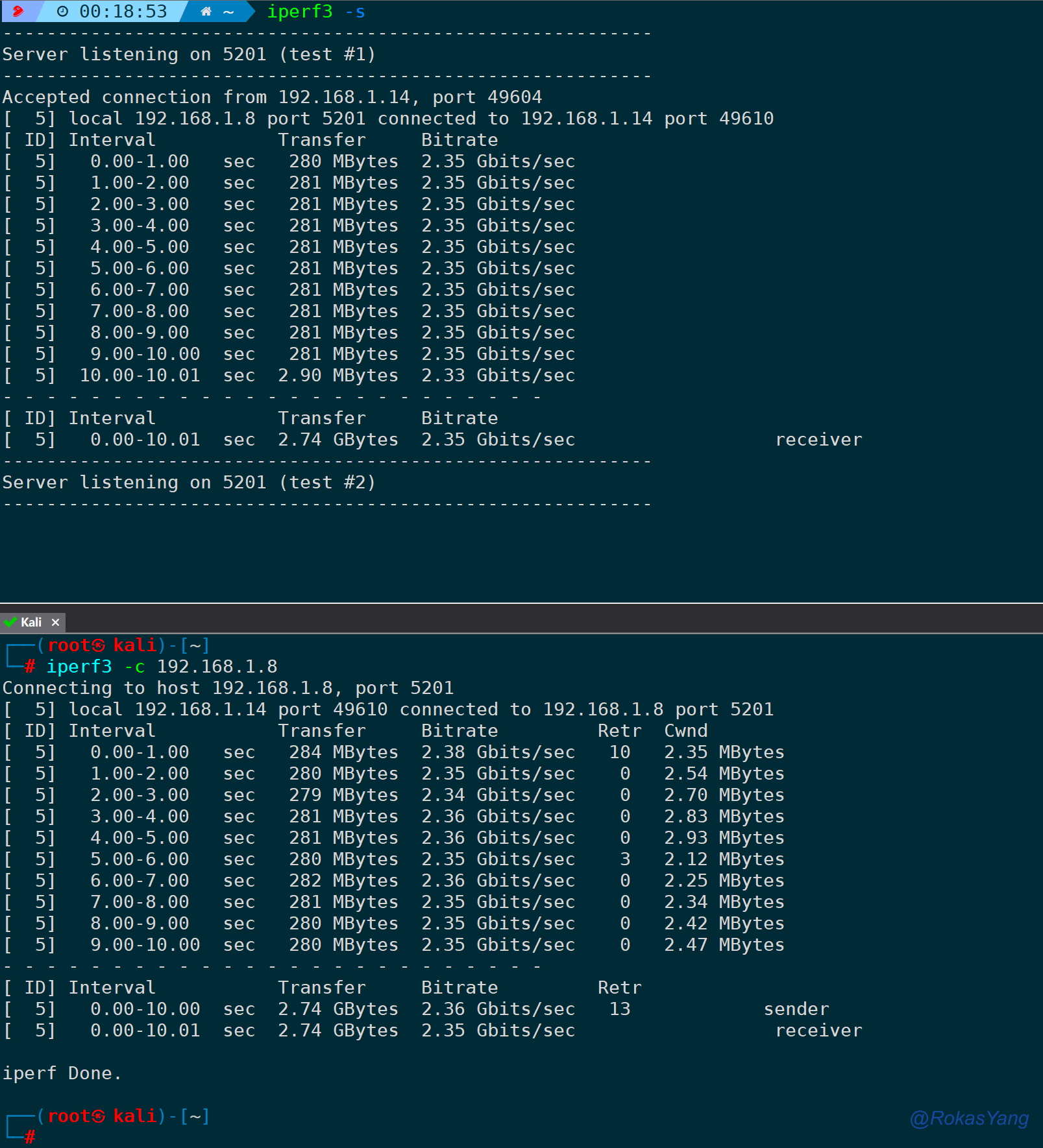 iperf3默认为单线程压测,通过-P选项可指定多线程(iperf2版本不支持多线程参数),用于突破单线程瓶颈,模拟高并发场景。