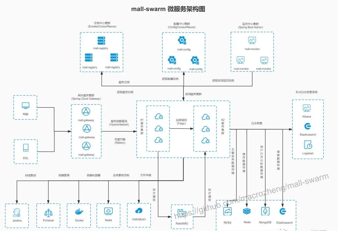 mall-swarm 是一套微服务商城系统,采用了 Spring Cloud Greenwich、Spring Boot 2、MyBatis、Docker、Elasticsearch等核心技术,同时提供了基于Vue的管理后台方便快速搭建系统。mall-swarm在电商业务的基础集成了注册中心、配置中心、监控中心、网关等系统功能。