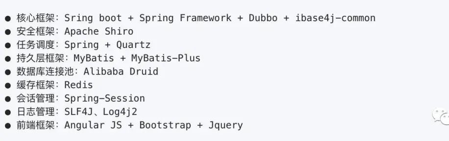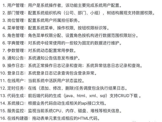 模块包括:企业级的认证系统、开发平台、应用监控、慢sql监控、统一日志、单点登录、Redis分布式高速缓存、配置中心、分布式任务调度、接口文档、代码生成等等。