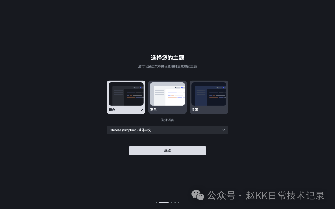 选择主题。可选项为 暗色、亮色 和 深蓝。