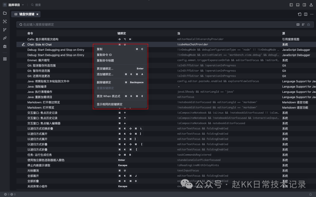 在列表中,右击某一快捷键条目。