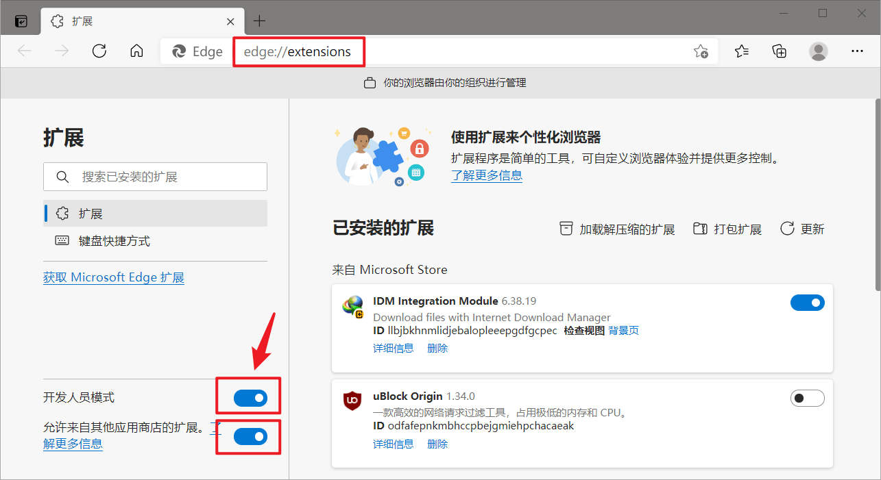 在地址栏中输入 edge://extensions复制链接,打开扩展管理页面,然后再打开左下角的【开发人员模式】和【允许来自其他应用商店的扩展】,然后刷新本页。