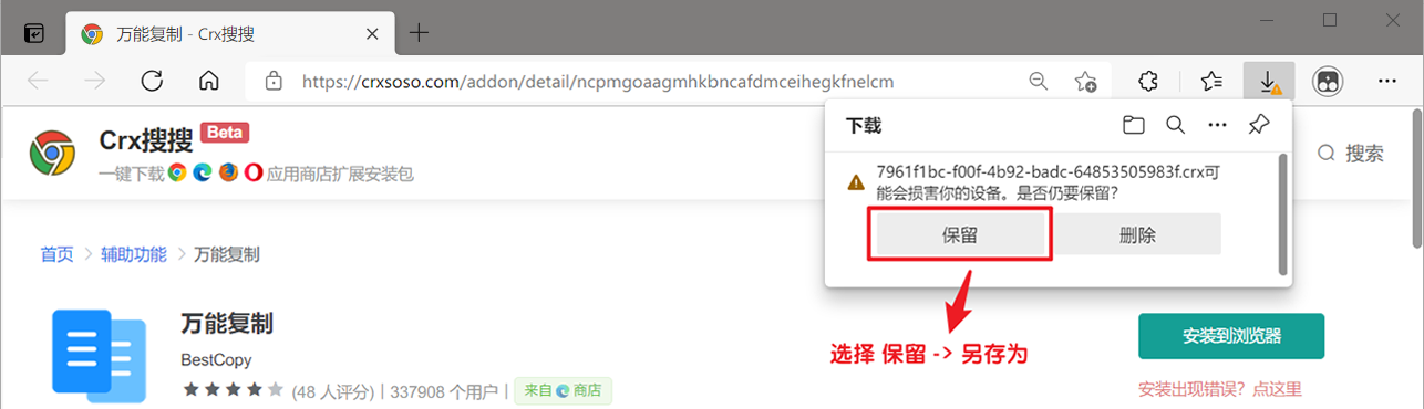 点击 安装到浏览器 会提示:xxx.crx 可能会损害你的设备。是否仍要保留?,此时选择 【保留】 => 【另存为】,将 crx 文件存放到电脑中。