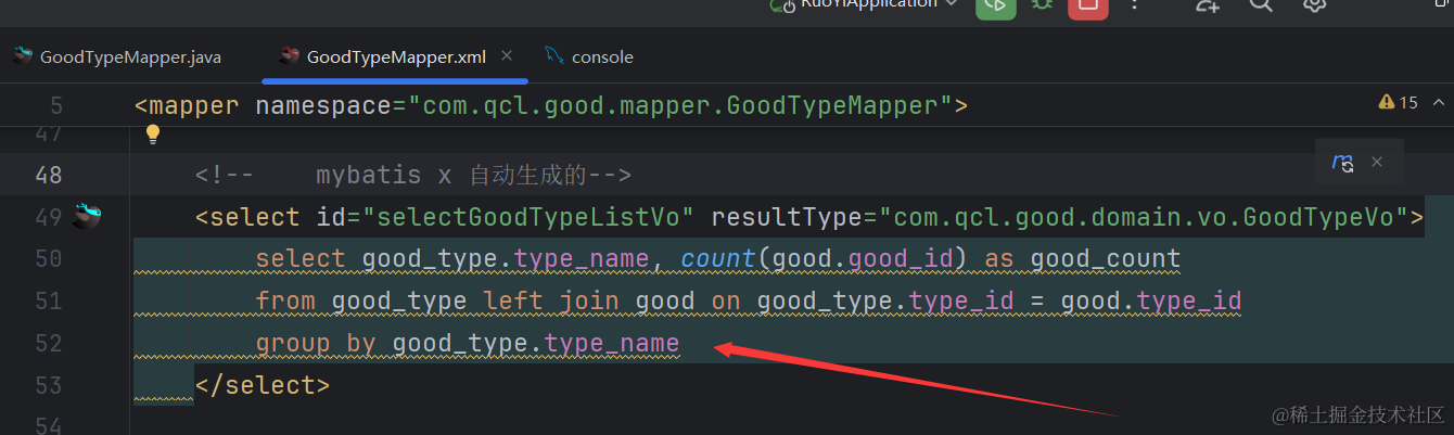 group by good_type.type_name;把上面的联表查询sql语句粘贴到xml里
