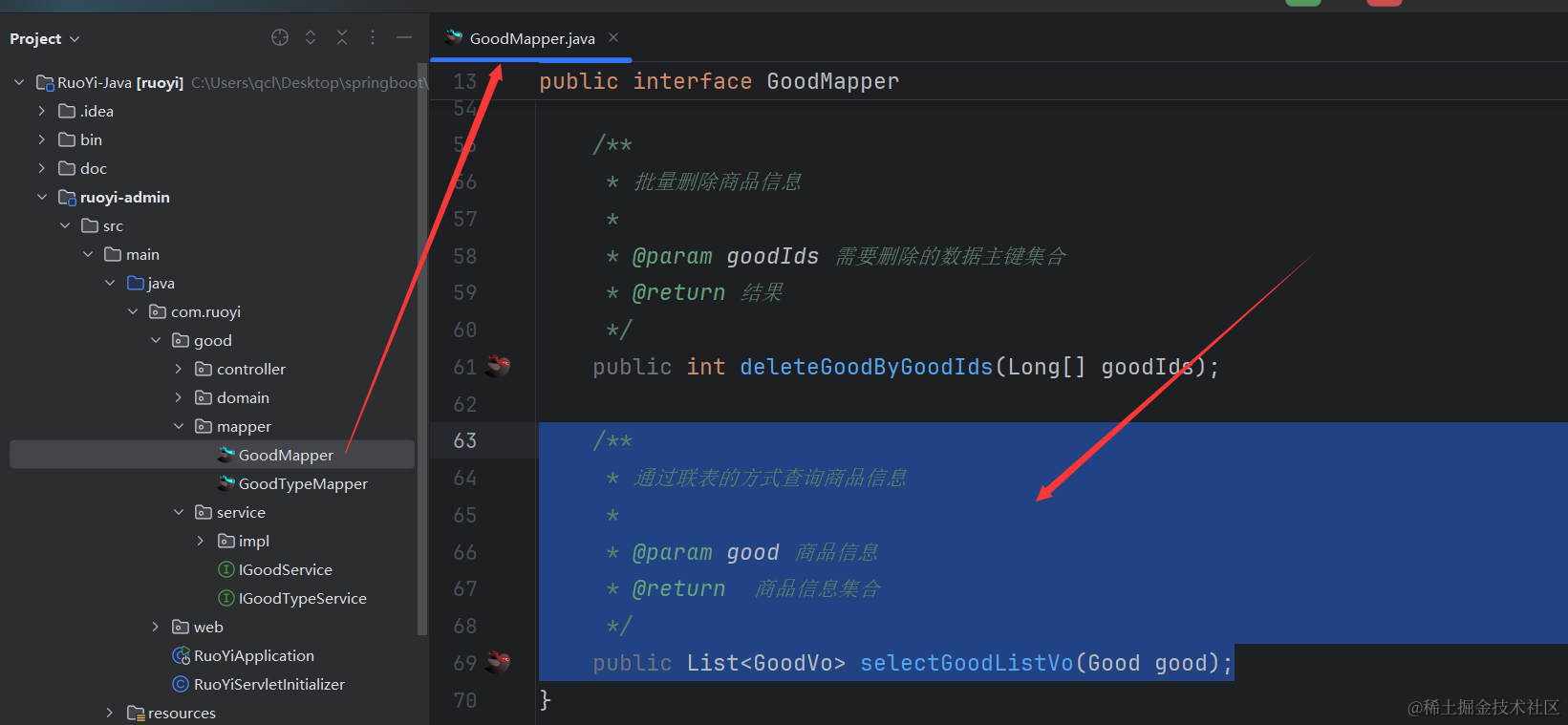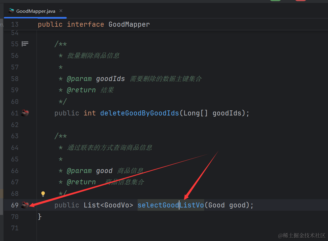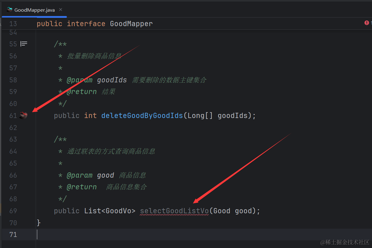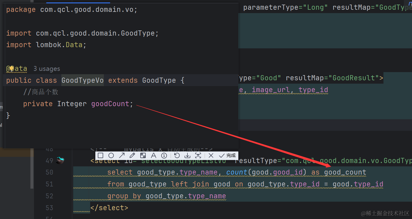 GoodTypeVo类代码很简单,就是定义一个我们要返回的goodCount字段,然后生成get和set方法。 然后在GoodTypeMapper接口里添加新的联表查询方法,如下