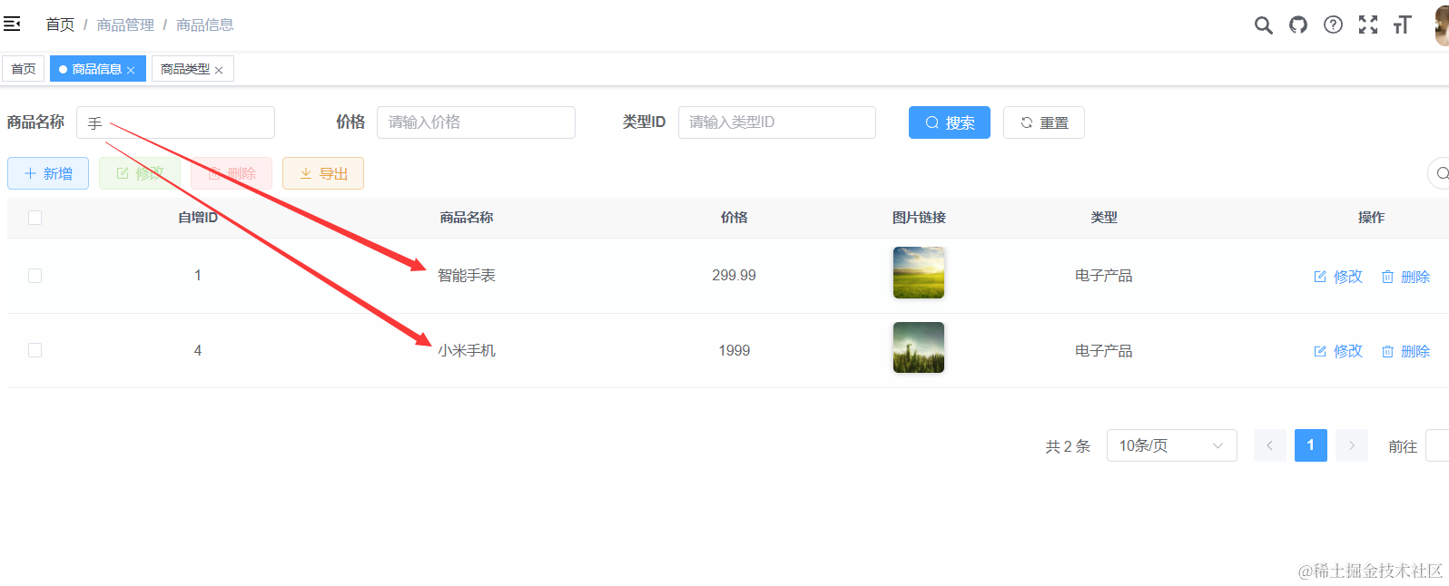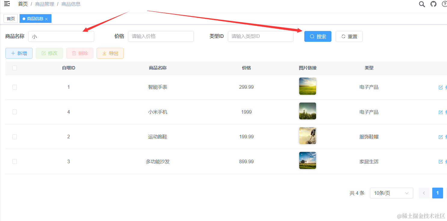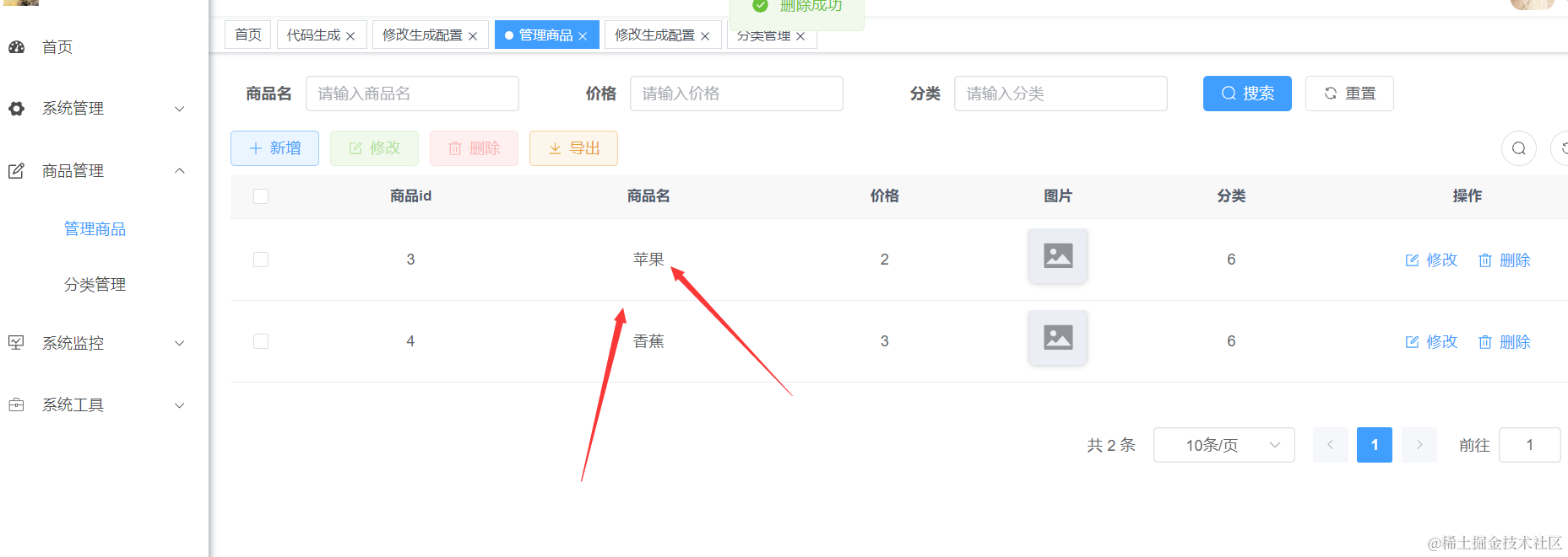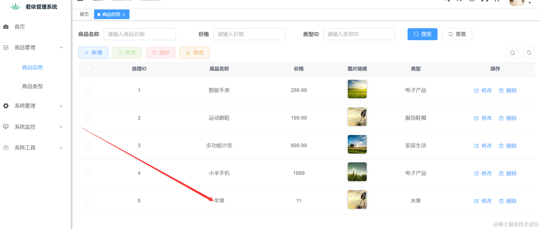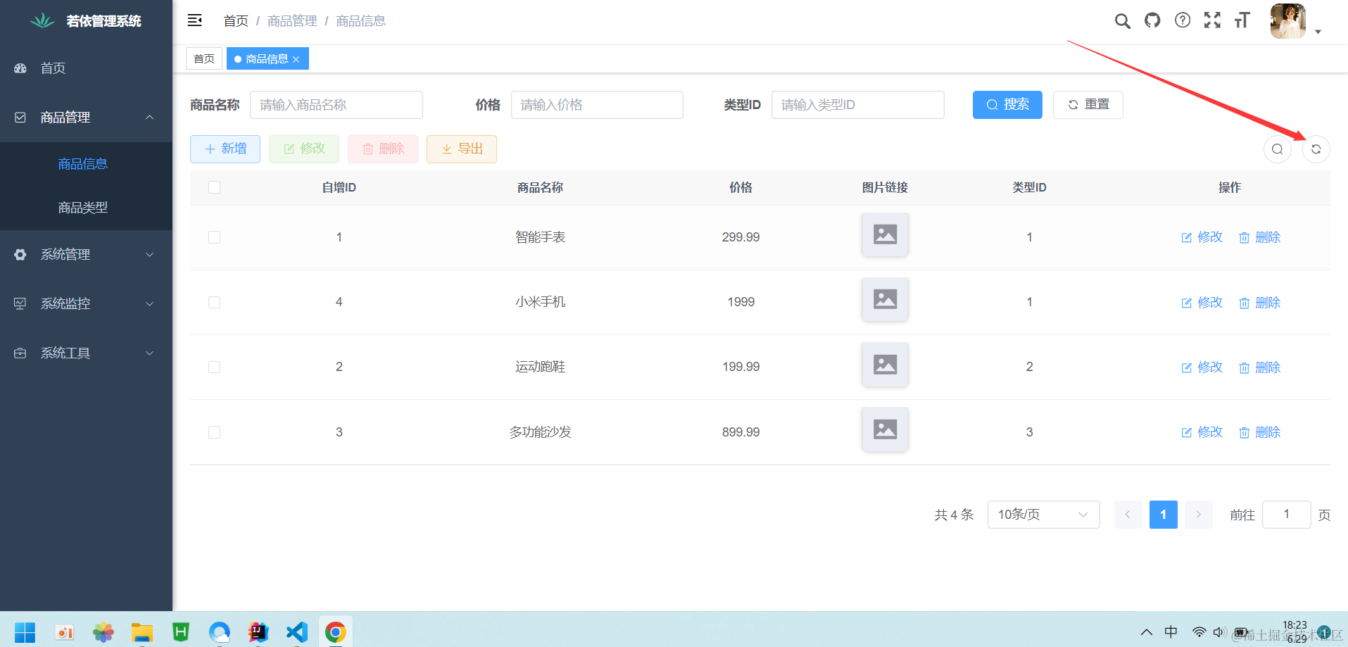 我们重启Java项目以后,去浏览器里刷新页面进入商品管理,然后点击下刷新