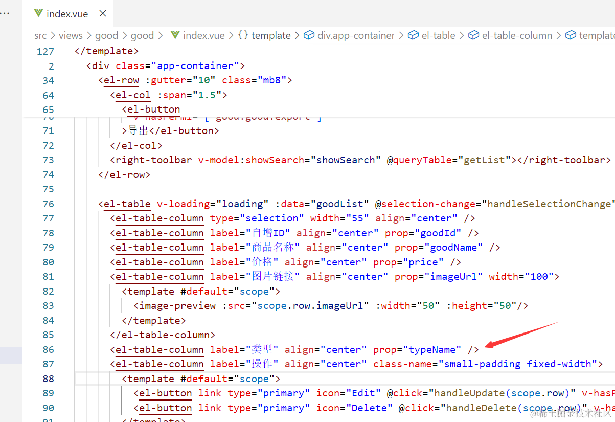 综上所述,此代码段在Element UI的表格中创建了一个列,用于展示数据列表中每个项目typeName字段的值,且该列标题为“类型”,内容居中显示。当绑定的数据发生变化时,这一列的内容也会相应更新,提供给用户一个实时反映数据状态的视图。