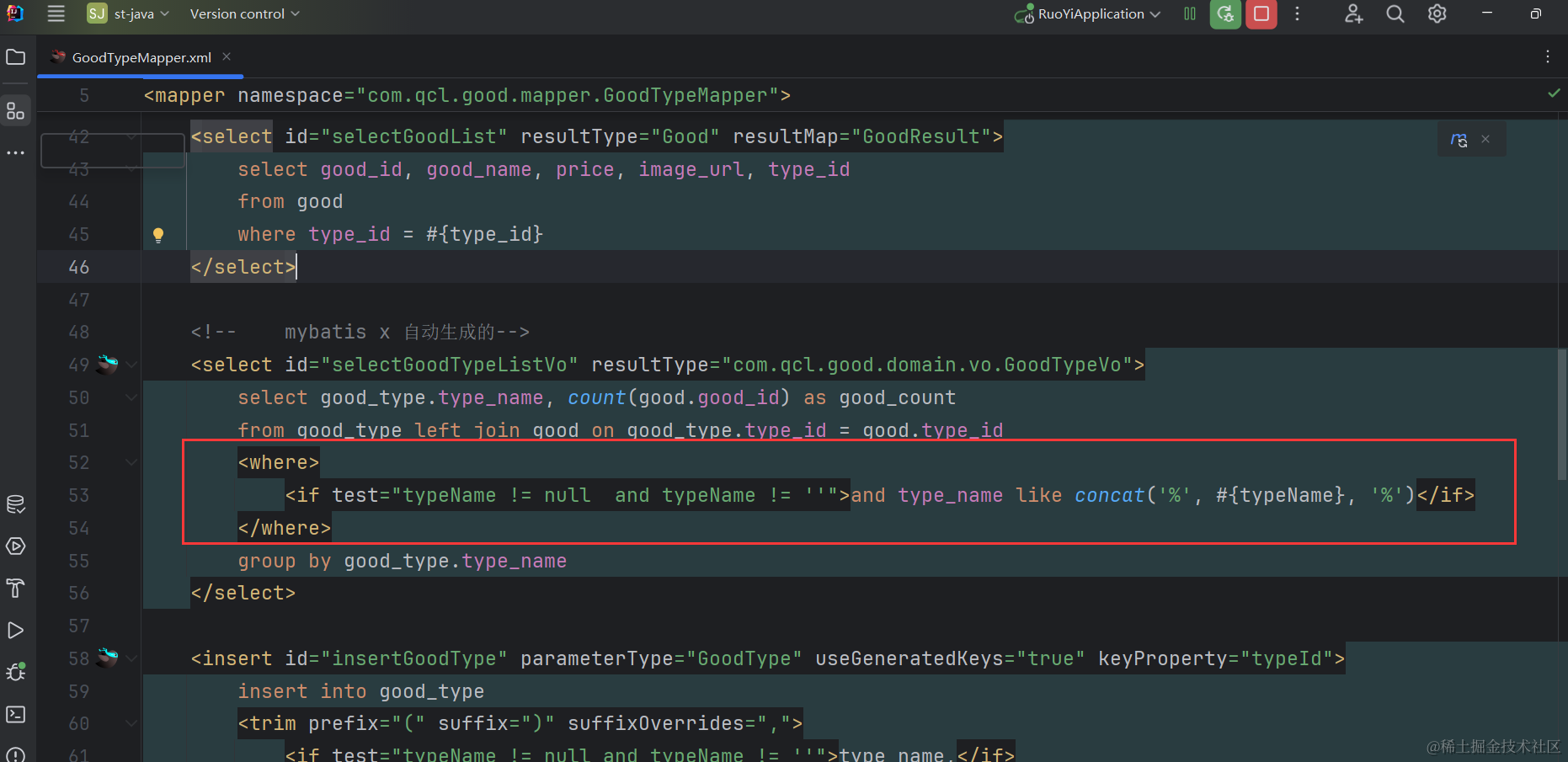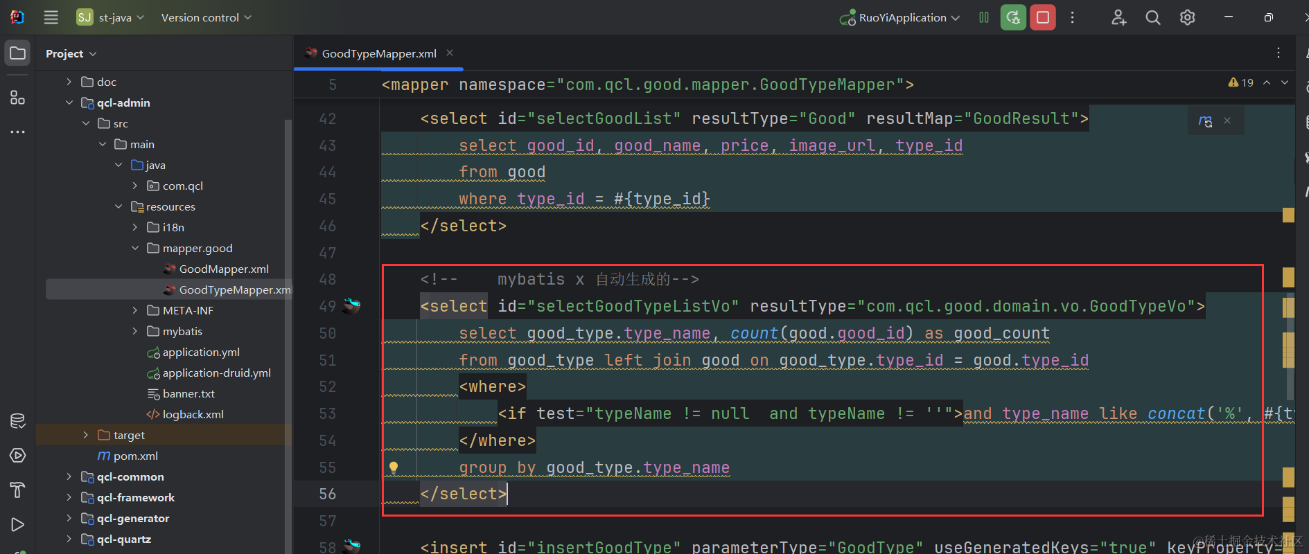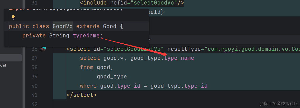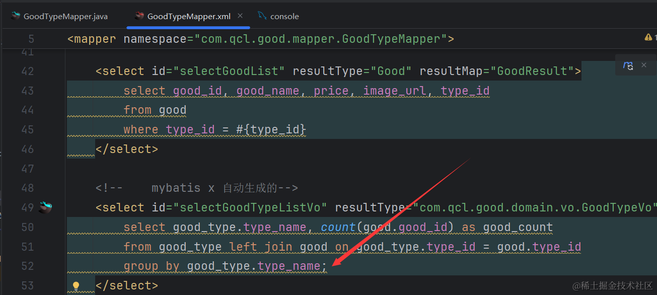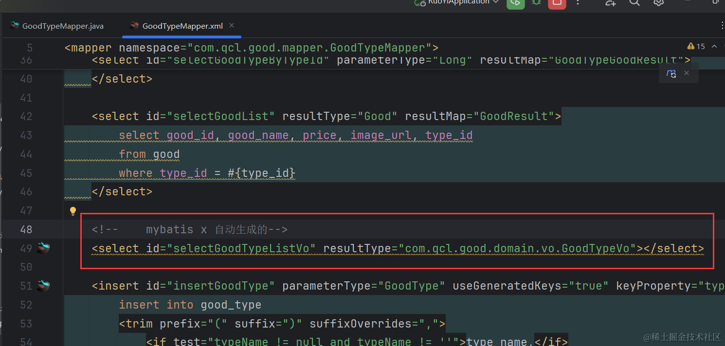 可以看到对应的xml里生成了selectGoodTypeListVo相关的xml代码
