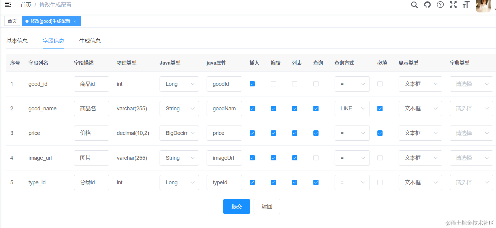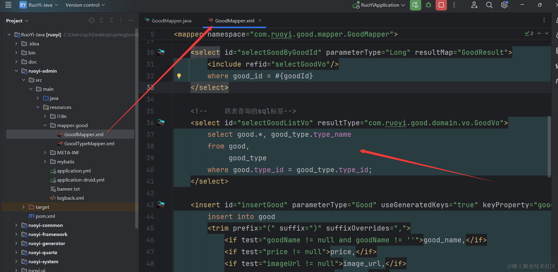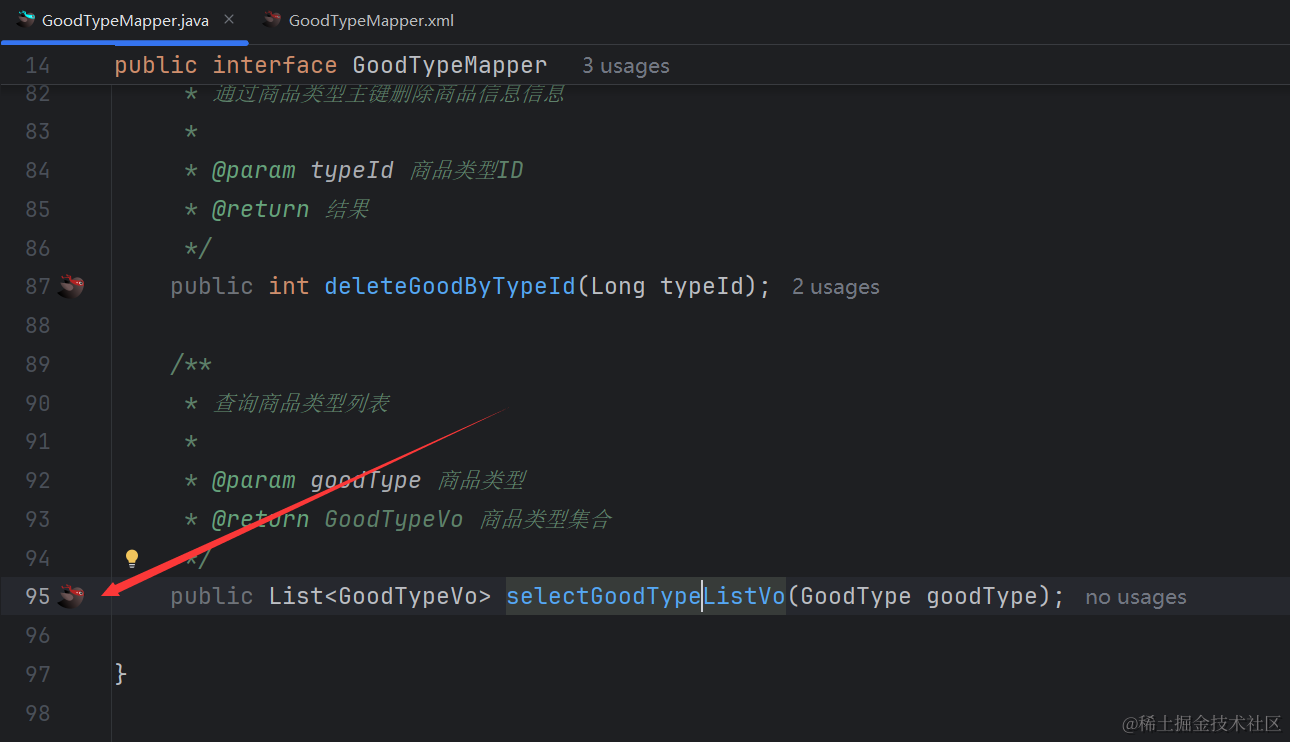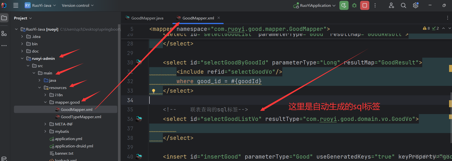 可以看到对应的xml里生成了selectGoodTypeListVo相关的xml代码