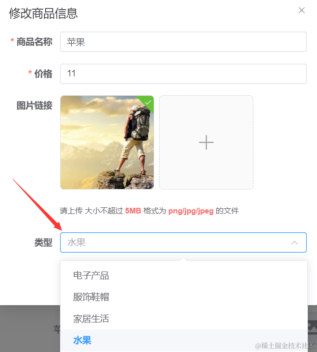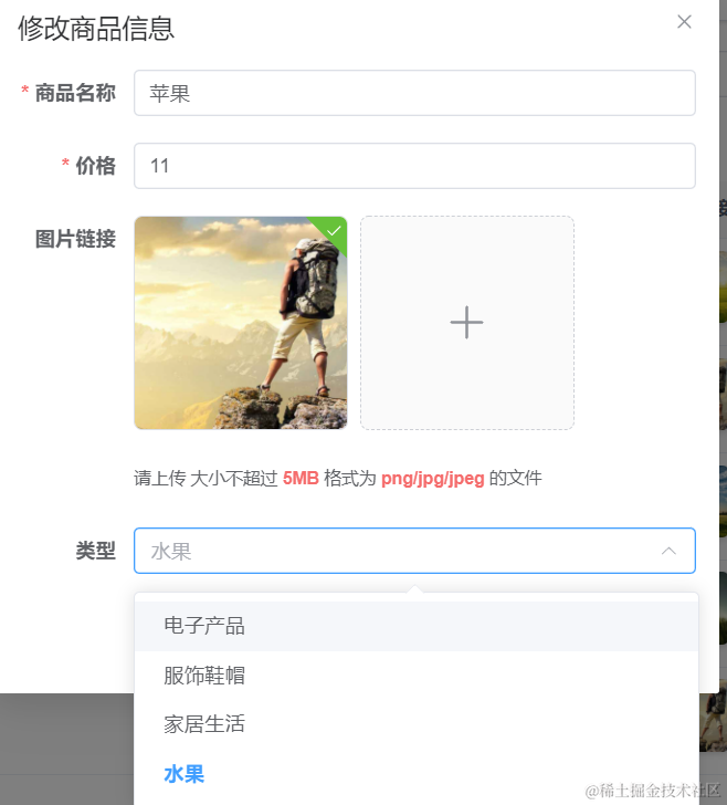 所以我们要改造下商品添加页面,让用户添加商品时可以通过下拉框选择商品分类。如下图: