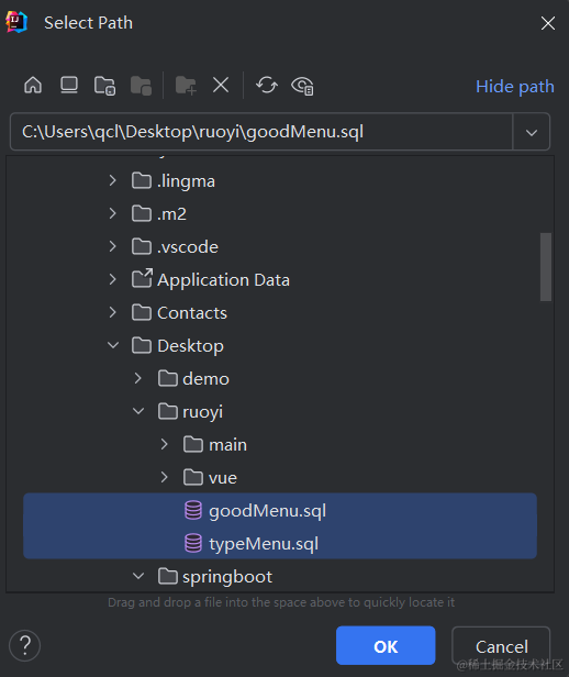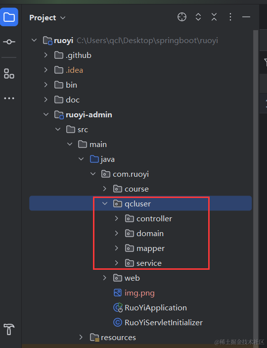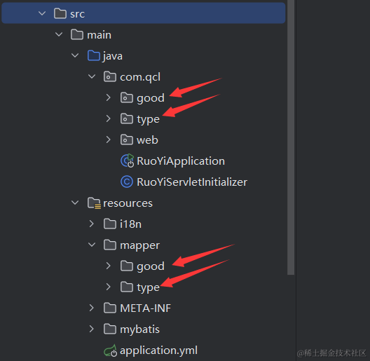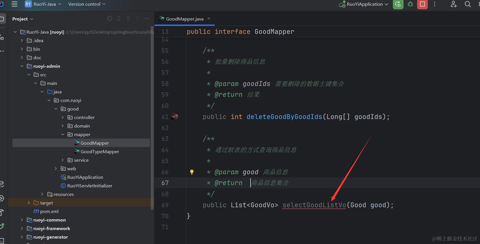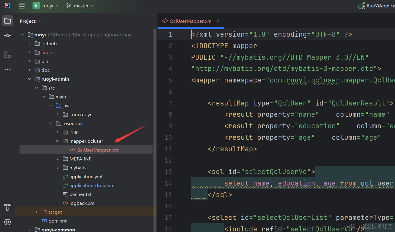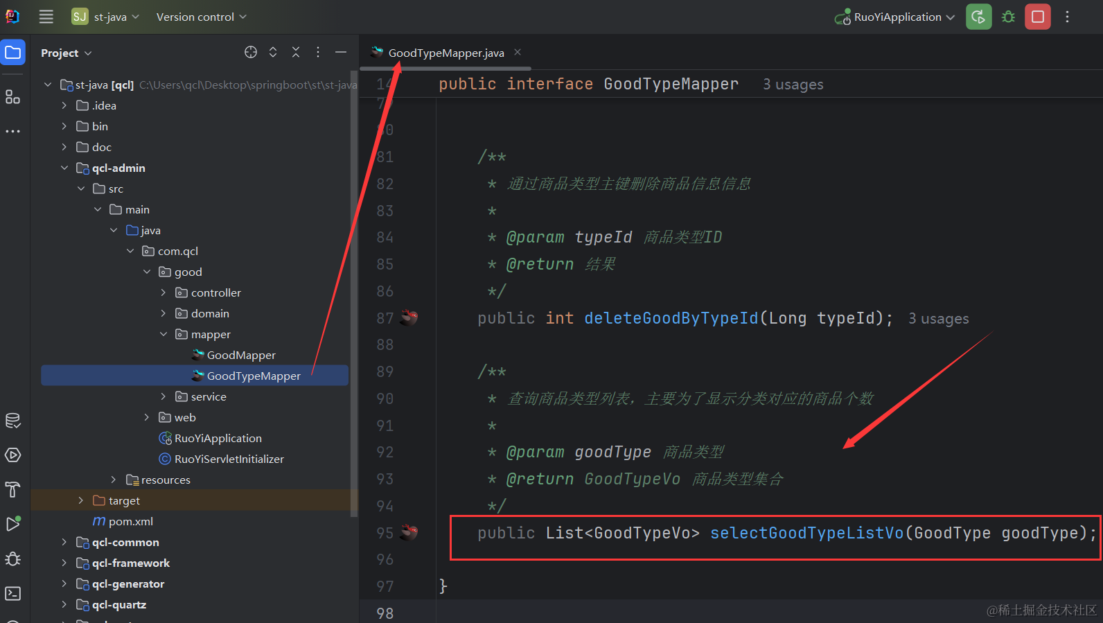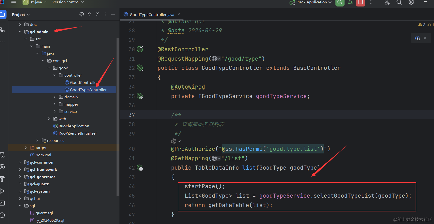 因为我们之前查询商品类型列表没有做联表查询,所以需要把商品类型的查询语句改造下,就是把下面的代码改造下。我这里的qcl-admin,就是你若依里的ruoyi-admin,因为我改了下项目名。