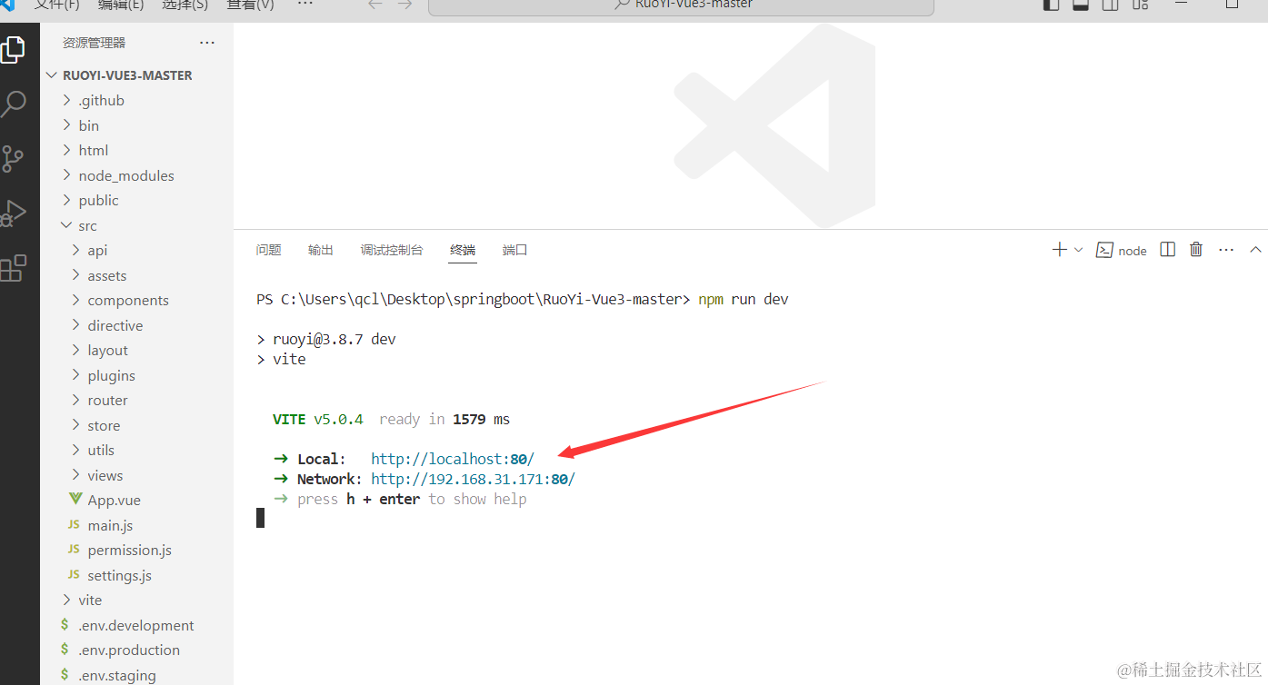 依赖安装完,就可以用npm run dev来运行项目了。运行成功后可以看到管理后端网站的访问地址。