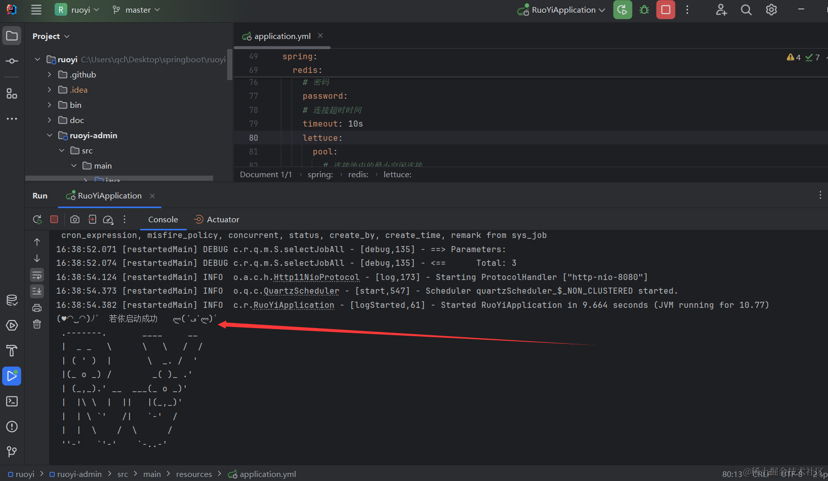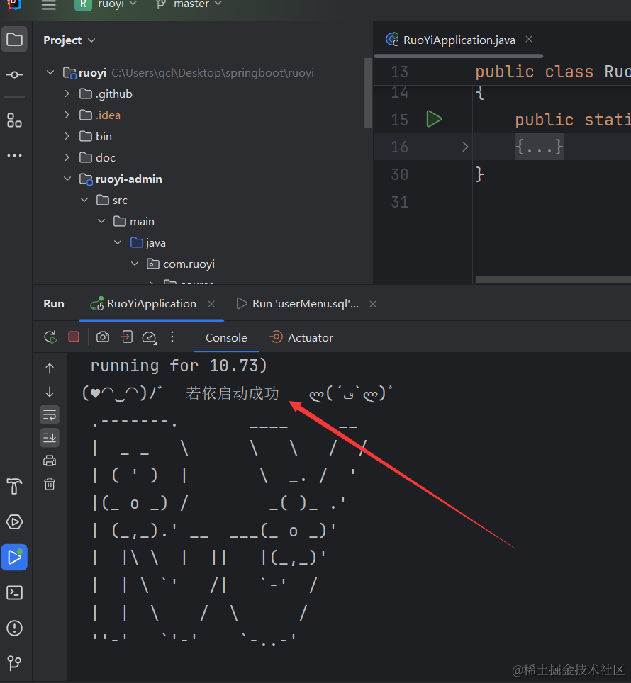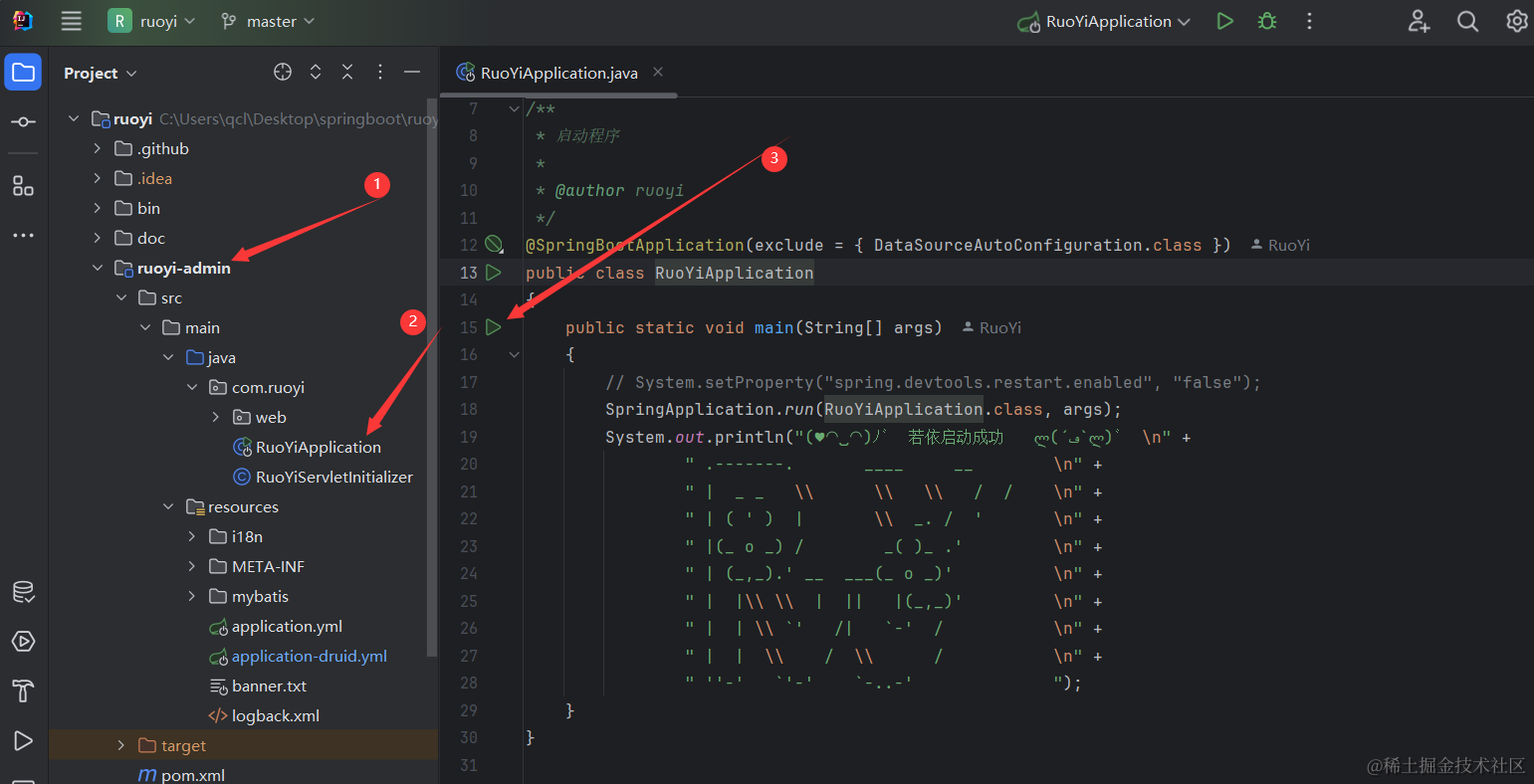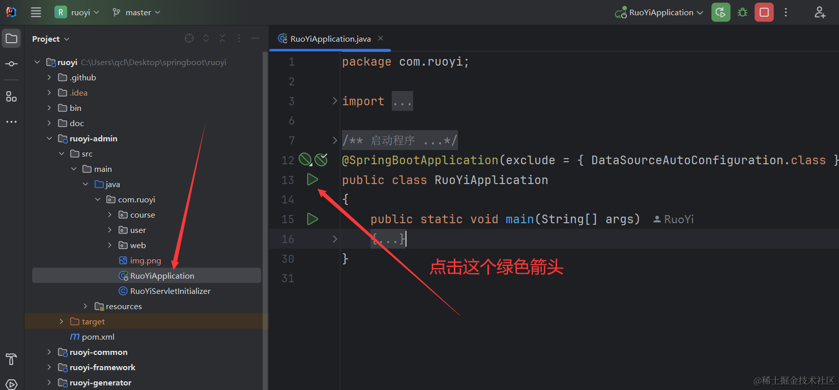 如下图所示我们找到RuoYiApplication然后就可以点击绿色箭头运行项目了。