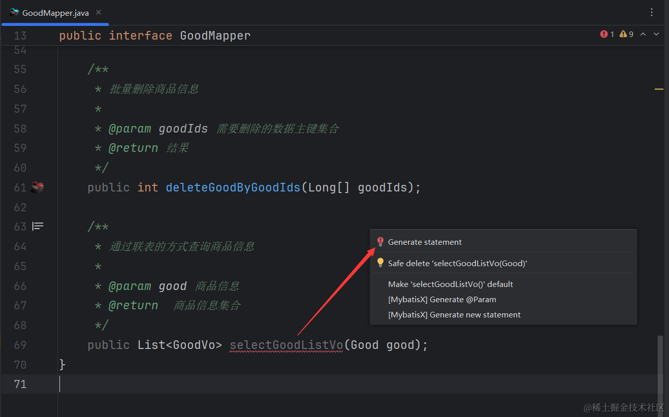 上图可以看到,有图标的就是xml里有对应的sql语句。没有图标的甚至方法名报红色波浪线的,代码xml里还没生成对应的sql。 其实生成也很简单,选中爆红的方法名,然后按 Alt+Enter快捷键,选则下图所示的Generate statement 就可以快速生成了