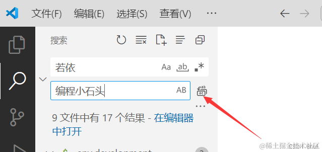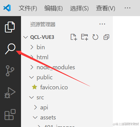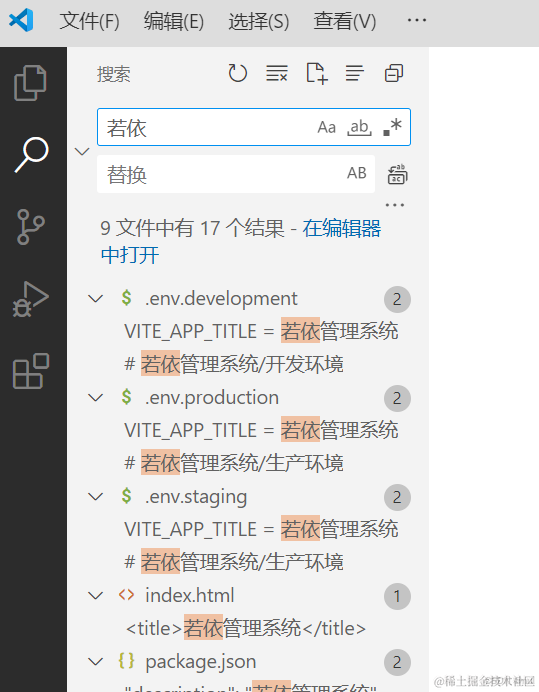 可以看到我们项目里到处都是若依的字样,那么我们就使用vscode自带的全局替换,来替换下。最左边有一个搜索框,点击下。